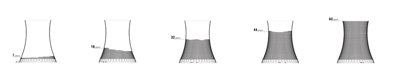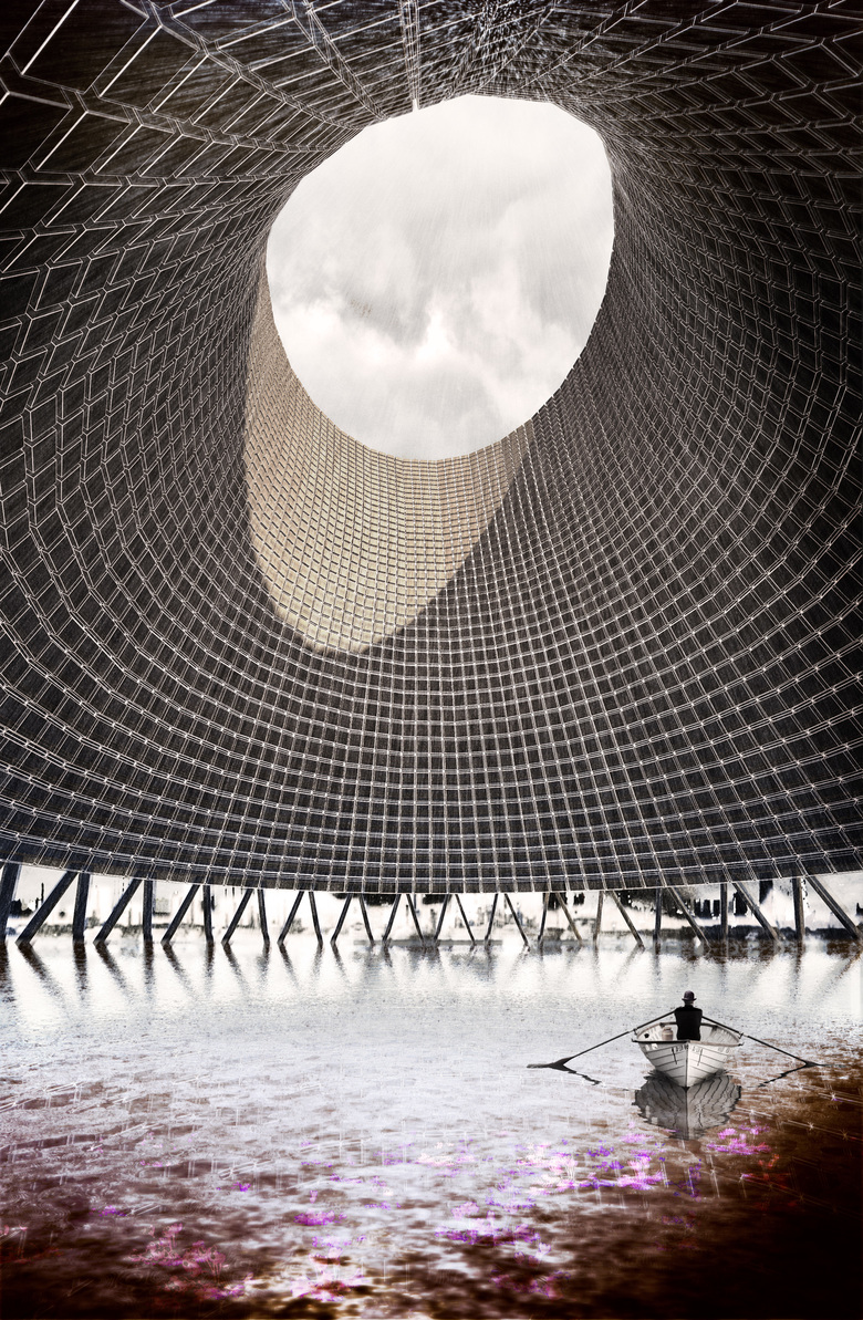 What might seem a utopic design at first is, in fact, a realistic point of view, introducing a reality-shift of human intervention: by allowing water to take over the land, the two cooling towers – the only interesting architectural residues of the plant – rise majestically above a lonely, meditative landscape. These monumental towers are easily re-interpreted as commemorative artefacts with 126 years of deceased beloved ones inside its concrete skins. 431.340 Resting urns that embrace the now ethereal Doel as the Necropolis of Antwerp.