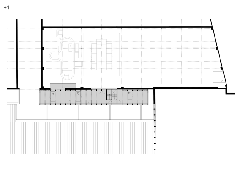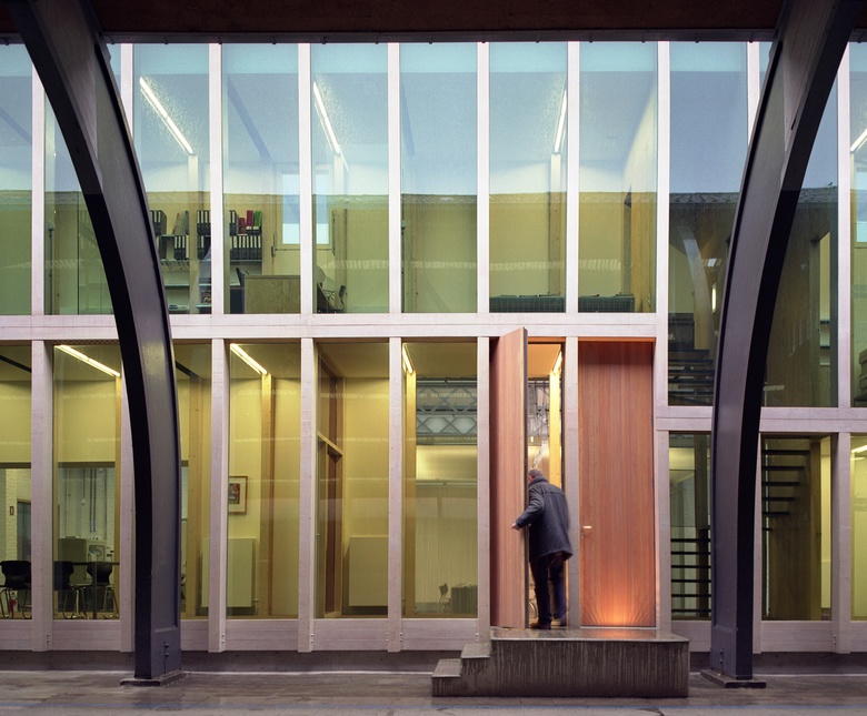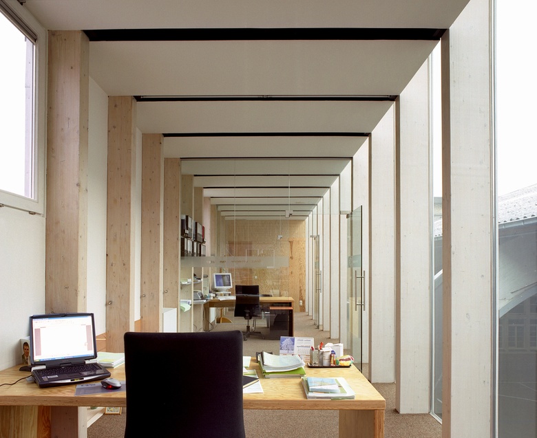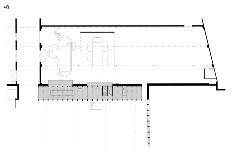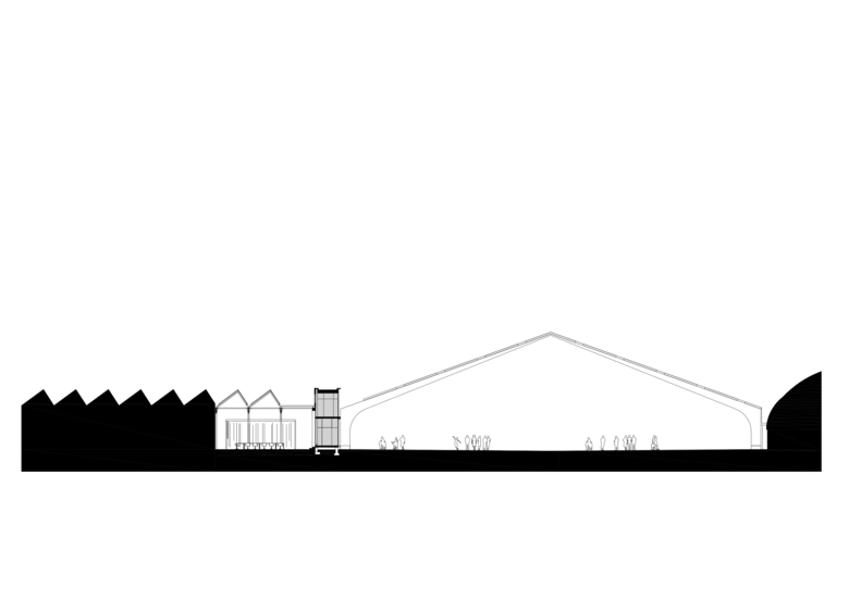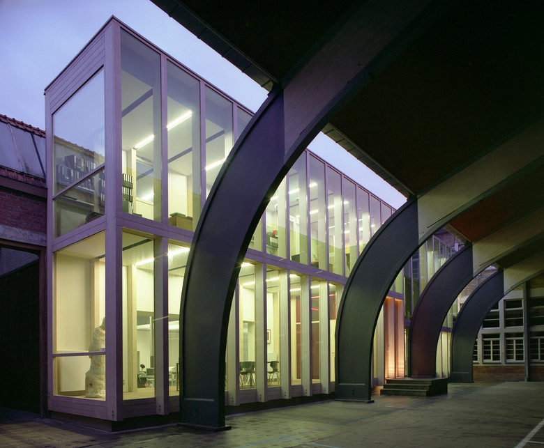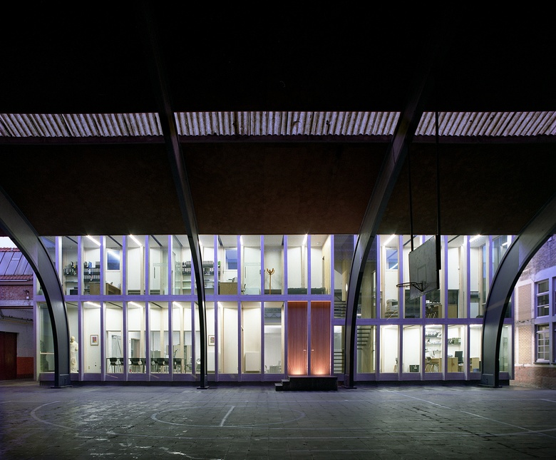 Het ontwerp eigent zich een no-nonsense strategie toe. Een verouderd sanitair blok werd afgebroken en in de donkere speelplaatsoverkapping werd een grote sleuf gemaakt. Dit geeft een lange, luchtige vide. In deze vrijgekomen strook werd een geprefabriceerde houtskeletstructuur opgetrokken. Deze geeft plaats aan de administratieve zone. Ze overziet zowel de achterliggende fabriekshal, de speelplaats als de hemelkoepel.