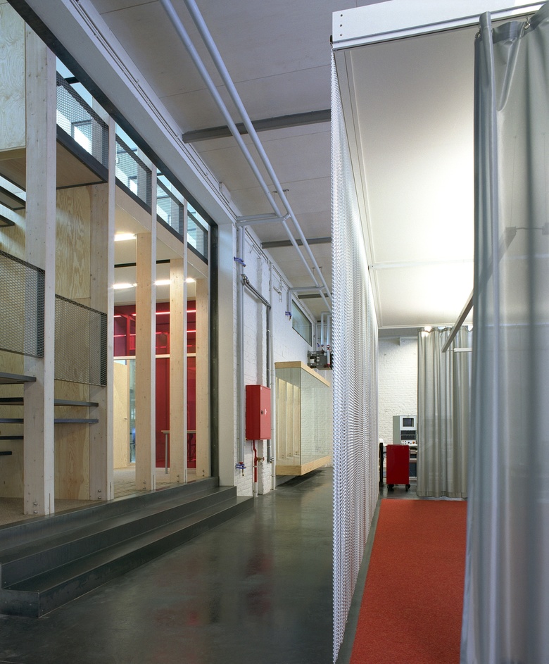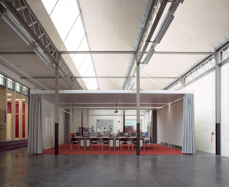 Het gevraagde leslokaal werd in de aanpalende fabriekshal voorzien: zwevend opgehangen aan de dakconstructie en afgezoomd met gordijnen. Een rood tapijt markeert de leszone. De roboticalijn is als kroonjuweel overal zichtbaar. Het leslokaal is transparent en laat gedeeltelijk inkijk toe.