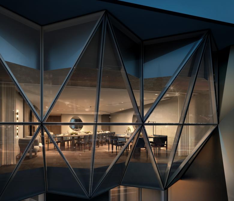 Architecturally, the building is distinguished by an undulating pattern across its front and back, generating visual appeal with a triangular, tessellated design on the east and west sides extending to the property’s edge. The triangular panels’ reflective surface enhances the interplay of light and shape, enriching the building’s aesthetic appeal.