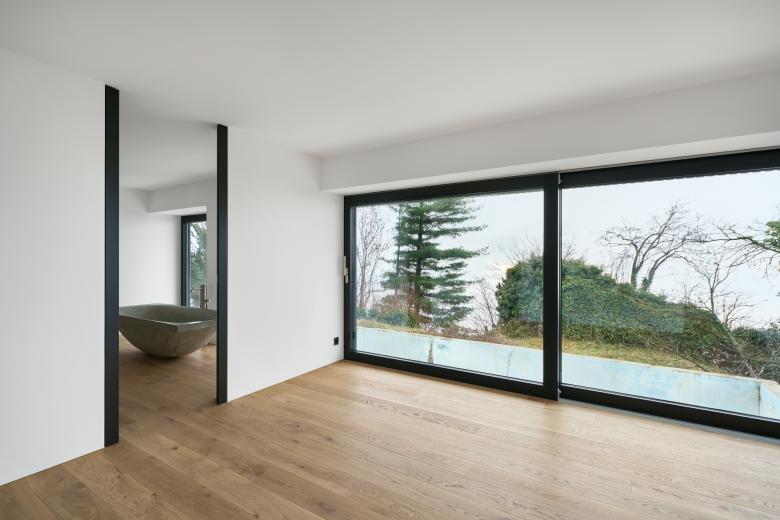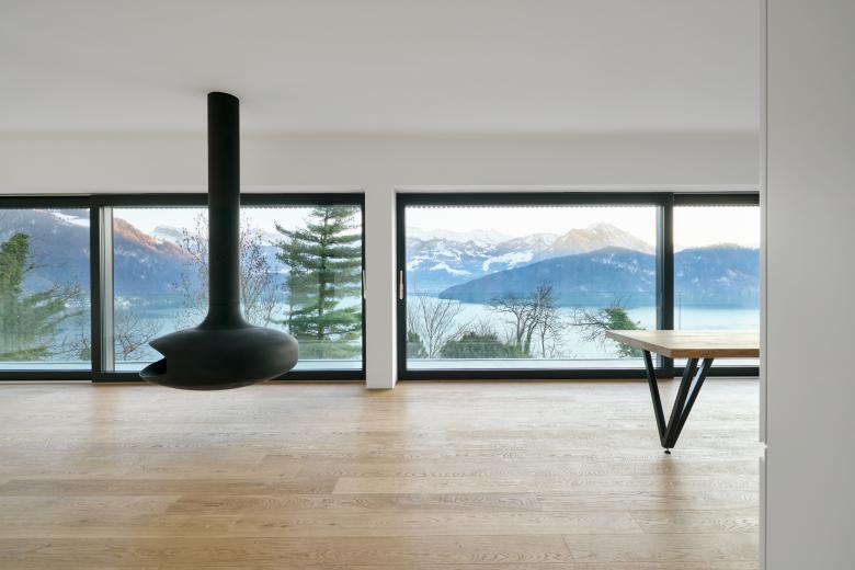 Die neue Grundrissgliederung pointiert die im Bestand angelegte starke Orientierung zum See hin. Die Wohn- und Schlafräume sowie das grosszügige Badezimmer sind - auf zwei Geschossen verteilt - in einer südseitigen Raumschicht situiert. Dunkle lineare Elemente wie Fenster- und Türrahmen setzten Akzente und fassen die Ausblicke.