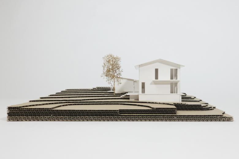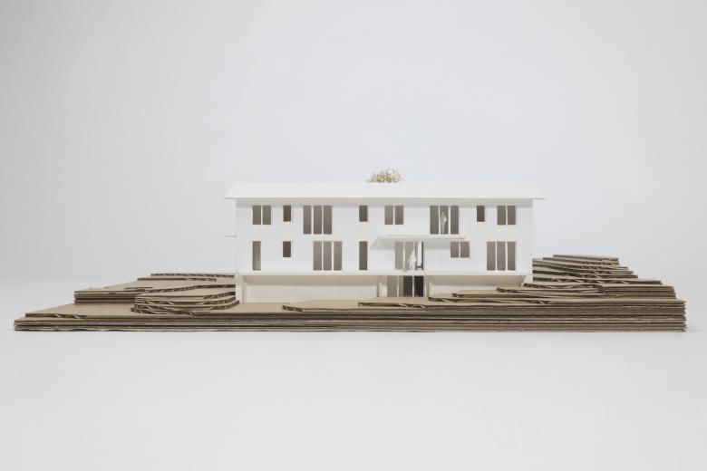 Der Zugang zu den Wohnungen erfolgt über ein gemeinsames Treppenhaus, welches sich zwischen Strassen- und Hangfassade aufspannt. Das Hochsteigen zum oberen Geschoss folgt dem Licht und bietet im Erdgeschoss zugleich einen Zugang in den gemeinsamen Garten.