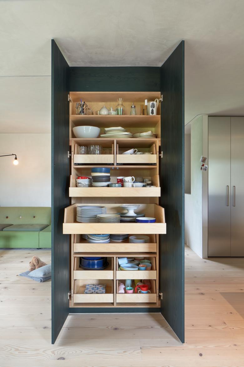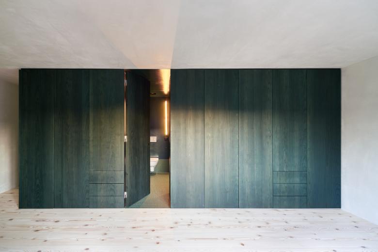 Im Sinne einer Binnenverdichtung sind im Souterrain ein Schlafzimmer sowie ein Badezimmer situiert. Eine vorhandene, ehemals von einem Öltank besetzte unterirdische Räumlichkeit wird neu als Werkraum genutzt. Der offene Wohn-/ Essraum im Hochparterre kontrastiert zur kleinteiligen Grundrissstruktur im Unter- und Obergeschoss.