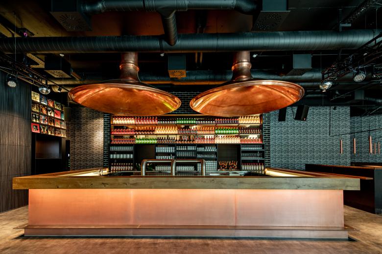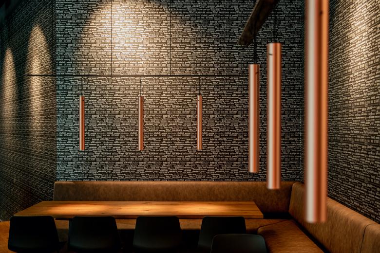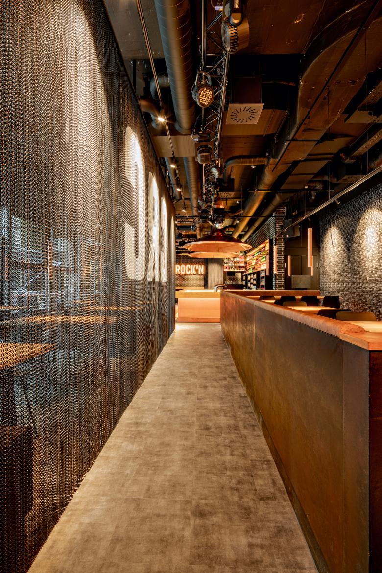 Das Classic Rock Café, kurz CRC, musste seine renommierte Kellerräume wegen einem Neubau in Stuttgart-Mitte weichen. Die Betreiber suchten nach neuen Räumen. Fündig wurden sie in einer städtischen B- Ebene am Übergang von der Innenstadt zur Universität. Die U-Bahnhaltestelle Börsenplatz öffnet sich hier in einem großen Halbrund zum Himmel. In der Tiefebene war bisher ein Mexikaner zuhause; diesen Sommer eröffnet das neue CRC. Die vertraute Kellerlage bleibt den Gästen also erhalten. Dafür verfügt der neue Standort erstmals über einen Außenbereich. Für die Neugestaltung holten sich die Betreiber den Stuttgarter Innenarchitekten Cyrus Ghanai an die Seite, dem die Stadt bereits so einige Gastronomie-Highlights verdankt. Die 325 Quadratmeter des neuen CRC hat Ghanai durch große Podeste gegliedert. In der Raumtiefe liegt der erhöhte Loungebereich, von dem aus der Blick ungestört durch das Lokal wandern kann. Hinter dem Eingang wiederum entstand, ebenfalls erhöht, ein kleiner Restauranttrakt, der durch einen Kettenvorhang von Kriskadecor zusätzlich abgeschirmt ist. Das zentrale Element des neuen CRC bildet allerdings der riesige Bartresen in der Raummitte. Die zwei markanten Kupfertrichter, die darüber schweben, sind aus der alten in die neue Location mitgewandert. Jeder Raumbereich besitzt eine eigene, auf die jeweils angedachte Nutzung abgestimmte Möblierung. So entwarf Ghanai etwa unterschiedliche hohe Tische – hier zum Essen, dort zum Chillen, an anderer Stelle zum entspannten Miteinander auf halber Höhe zwischen Sitzen und Stehen. Besonders gelang auch die Gestaltung der Wände. Dafür wurden Schriftzüge bekannter Rockbands verfremdet und auf Tapetenbahnen arrangiert. Auf den ersten Blick wirkt das vor allem dekorativ – auf den zweiten Blick auch noch unglaublich charmant und unterhaltsam.
