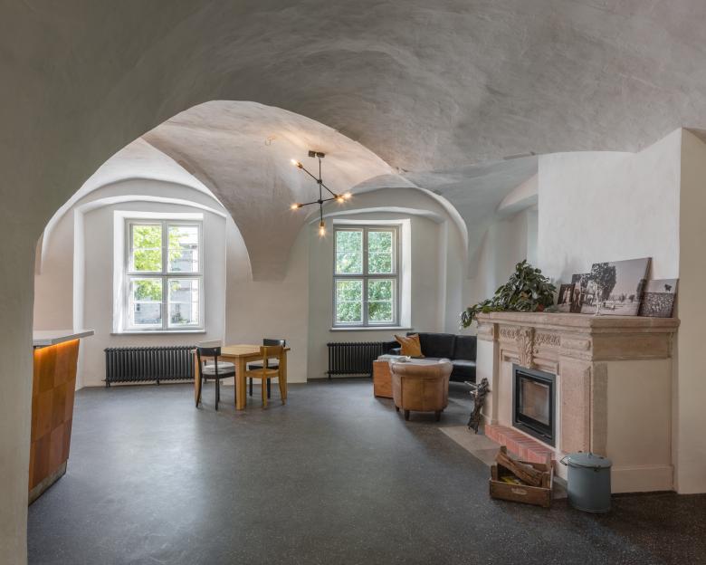 Das denkmalpflegerische Konzept sah für die Instandsetzung neben dem größtmöglichen Erhalt der Substanz auch eine weitgehend gleichberechtigte Behandlung aller Bauzeiten vor, ohne eine bestimmte Epoche rekonstruieren zu wollen. Im Resultat lassen sich in Innenräumen an Wänden und Decken viele Zeitschichten der wechselvollen Historie des Hauses ablesen, so sind etwa die bauzeitliche Schwarze Küche und der nebenliegende Saal durch eine vorgefundene Wandöffnung verbunden, die als Projektorfenster des im 20. Jahrhundert zeitweise eingerichteten Kino-Saals diente.