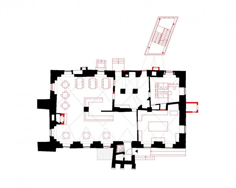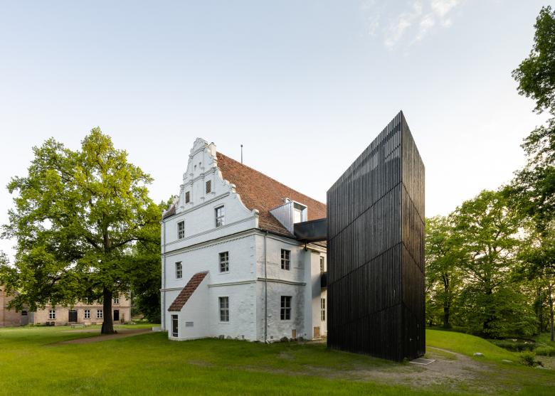 Deutlichster Eingriff jedoch ist die Errichtung eines externen Treppenturmes, der sich markant hinter dem Bauwerk erhebt, als wolle er einen stabilisierenden Anker für den sich nach vorn neigenden, historischen Schlossturm bilden. Die mit karbonisiertem Holz verkleidete Stahlkonstruktion schließt als sichtbar zeitgenössisches Element an das Schloss an und stellt mit seiner rauen, rußigen Oberfläche ein eher dem angrenzenden Wald zugewandtes Pendant zur strahlend weißen Putzfassade dar.