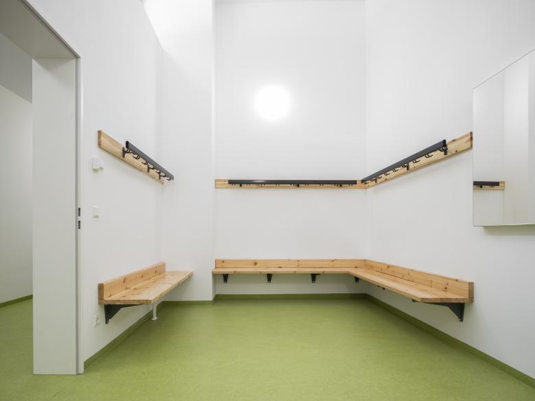 Um die engen Räumlichkeiten zu erweitern, ergänzten D/FORM Architekten den Umkleidetrakt um einen 100 m² großen Neubau und schufen einen neuen Eingangsbereich. Die zusätzlichen Dachflächen ermöglichten eine Begrünung, die im Altbau nicht realisierbar war.