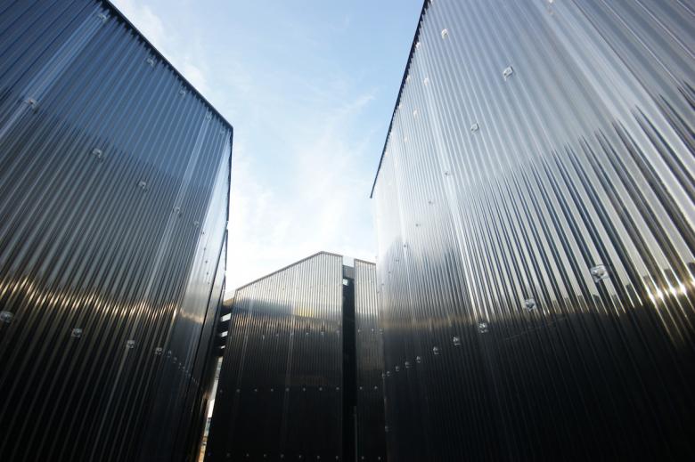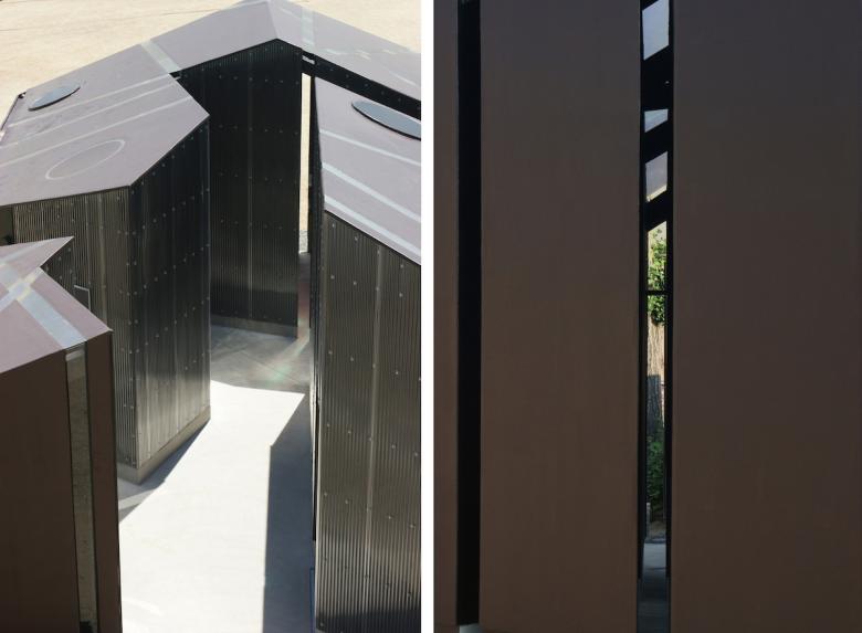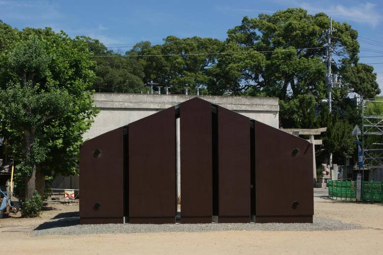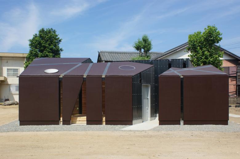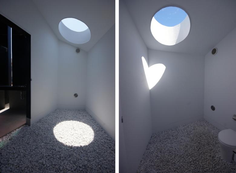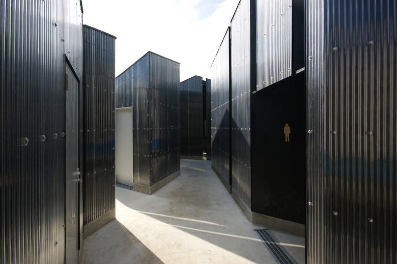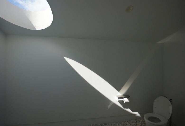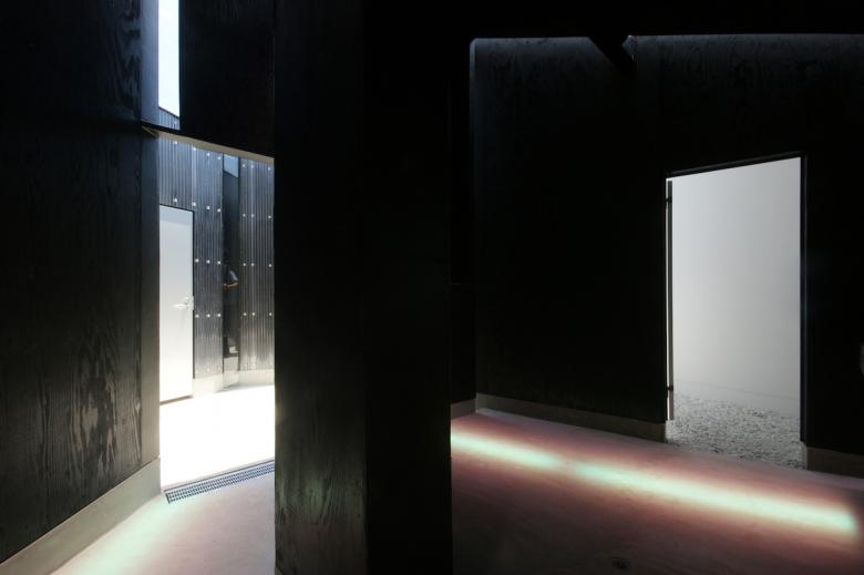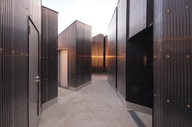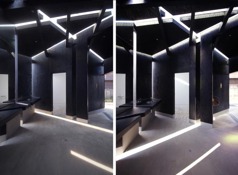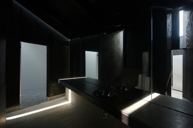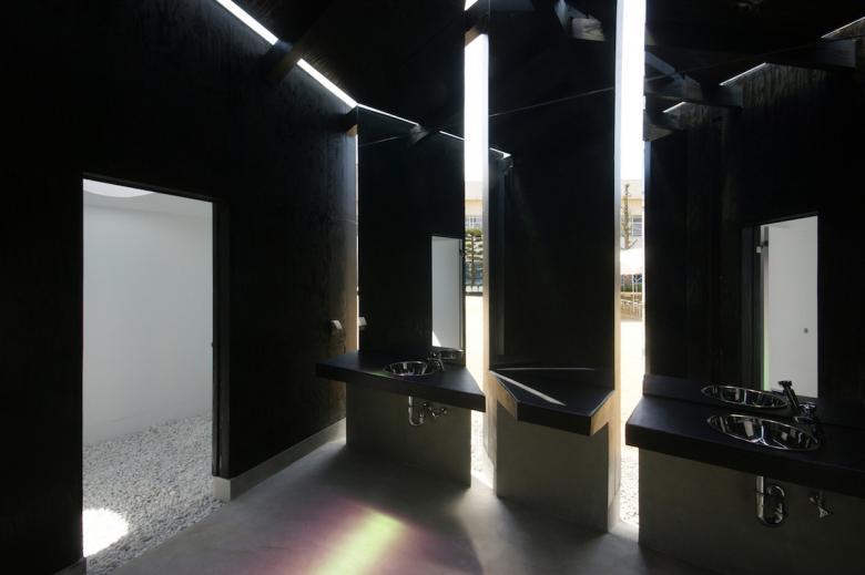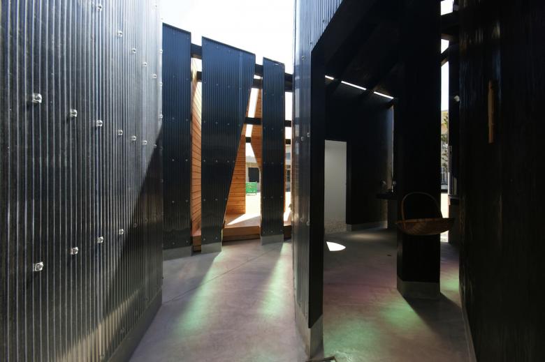The roof is aligned with the roof inclination of a local house, and the color of the outer wall is based on the color survey of a local house on the island. The alley created by the slit of light leads to the alley of Ibukijima like a maze. The wall of the alley and the interior wall of the lavatory are based on the image of the burnt cedar board as a typical finish but are not necessarily the same as it. They are slightly different due to the polycarbonate corrugated sheets that reflect the scenery on the surface. In the booth at the depth of the indoor, the big opening is opened on the roof. The natural light and the rainfall indoors. It is as if they have looked up from the bottom of the local well for collecting rainwater peculiar to the island's lack of water. When they go to the toilet booth at the back of the room, there is a big opening on the roof. Light and rain fall into the room, but drainage holes are provided under the gravel on the floor, and the walls and ceiling are made for outdoor use.