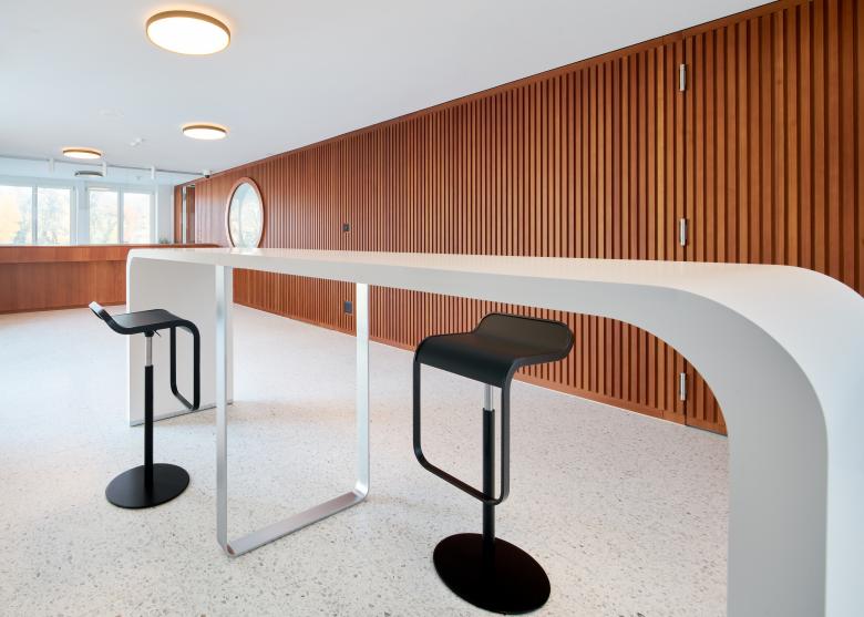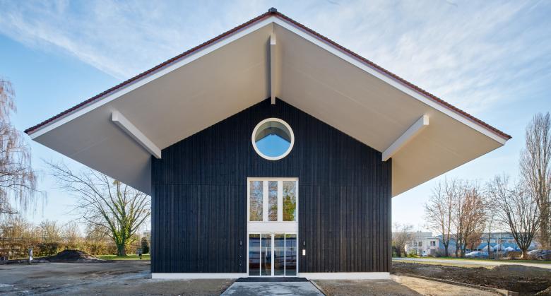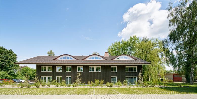 - eine hinterlüftete Holzfassade den Alt- und Neubau verkleidet. Die Holzverkleidung nimmt Bezug zu den Bootshäusern in der Umgebung.