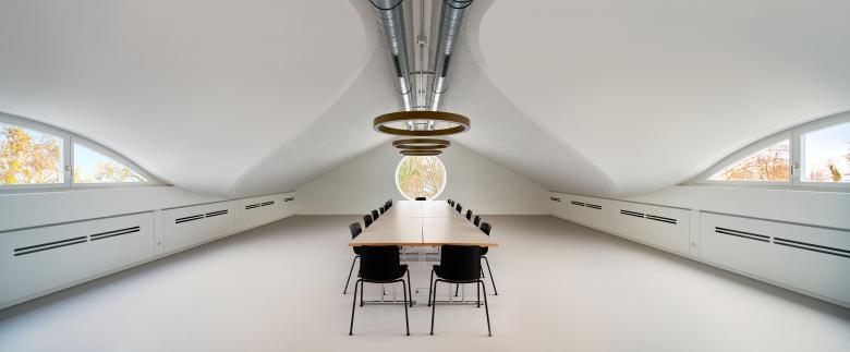 - das bestehende Dach im Altbau ersetzt, in seiner Neigung verändert und mit Aufschieblingen ergänzt wird, so dass neben den überdachten Zugangsbereichen auch die Proportion des Gebäudes verändert wird, die Dachabschlüsse filigran wirken und die Dachdämmung, insbesondere im Altbau, optimiert wird.