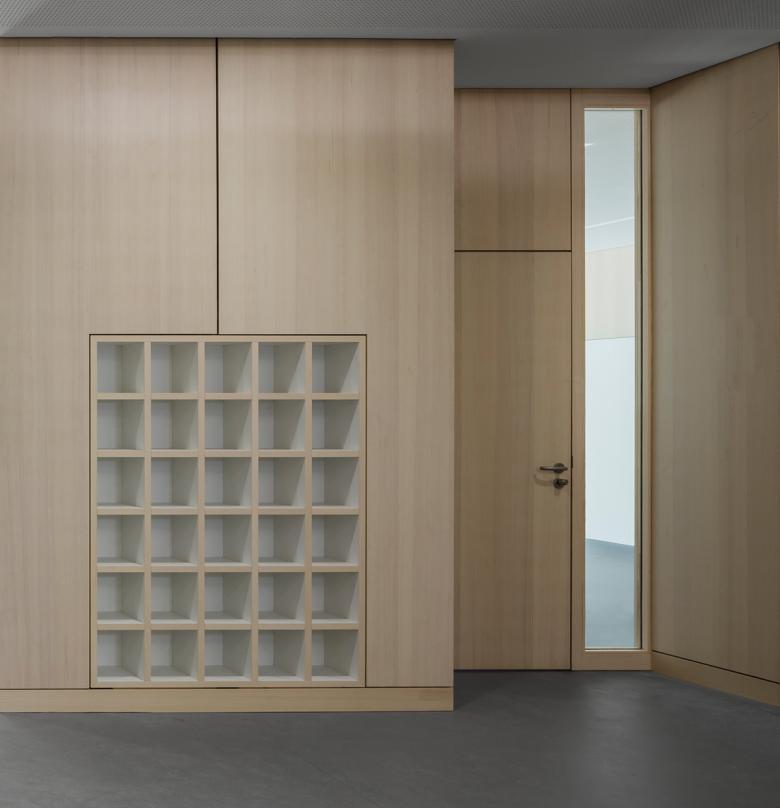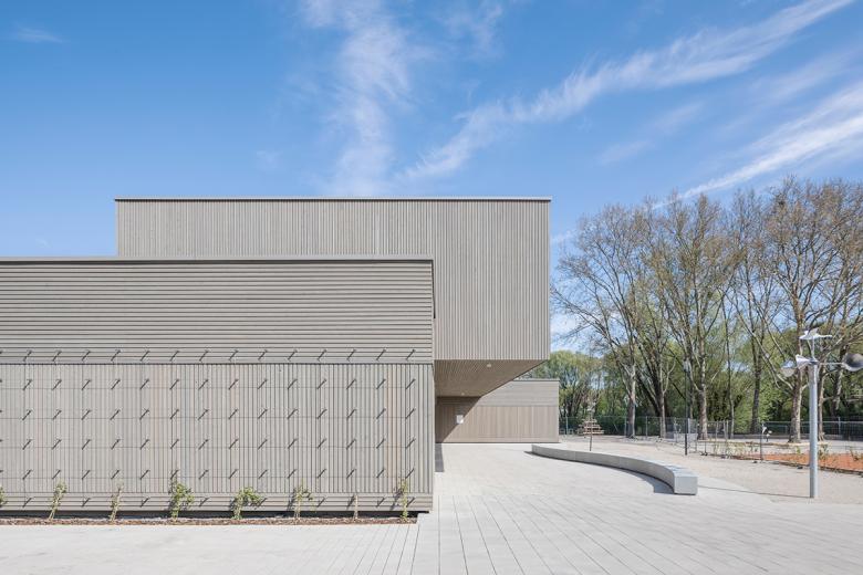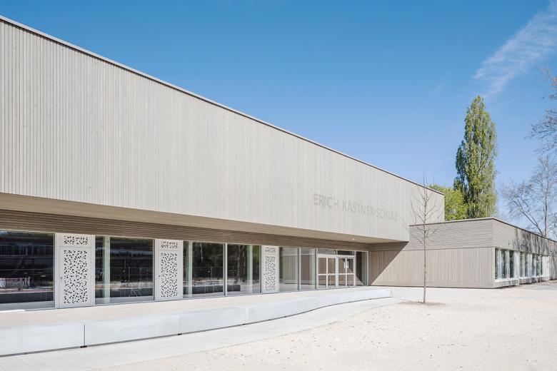 Die Außenwände des Erweiterungsbaus erhalten eine lasierte Brettschalung, das Flachdach als „fünfte Ansicht“ für die umgebenden mehrgeschossigen Gebäude ist extensiv begrünt und mit Photovoltaik-Elementen bestückt.