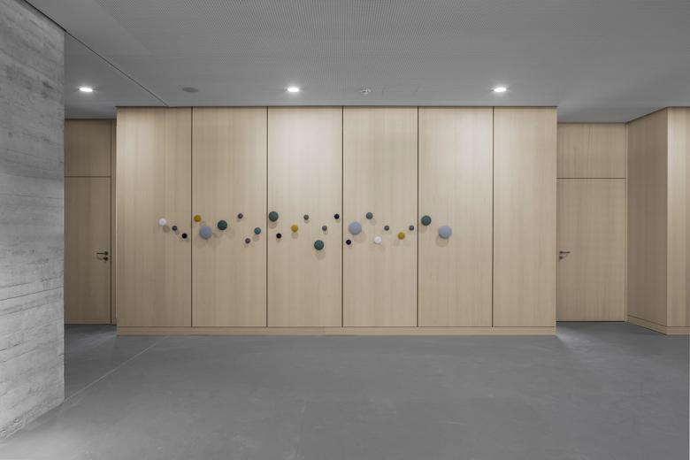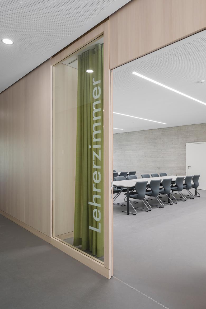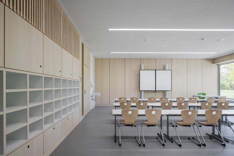 Um das zentrale Foyer lagern sich drei Nutzungsbereiche: die Klassenräume mit dazwischen liegenden Differenzierungsräumen, der Lehrer- und Verwaltungsbereich und die Mensa mit Multifunktions- und Kunstraum