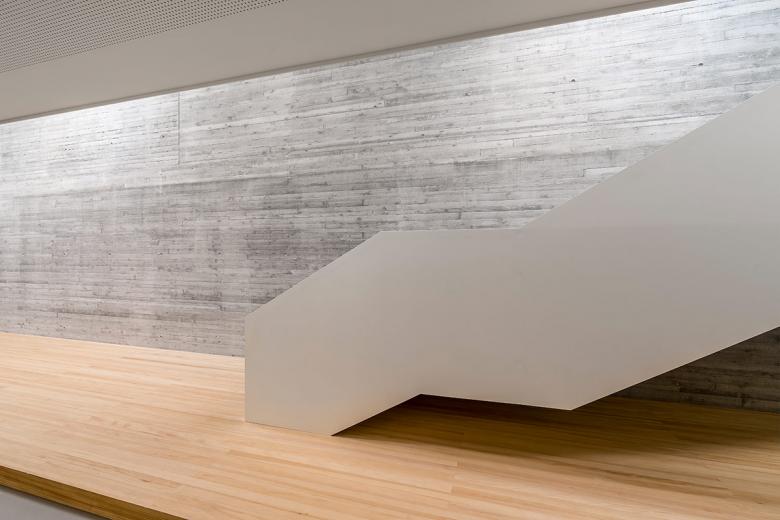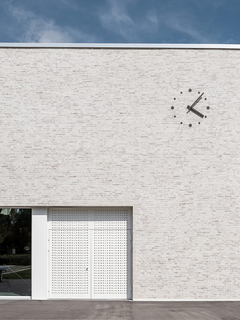 Die plastische Ausformung des Baukörpers wird durch die einheitliche Materialwahl gestärkt: die geschlossenen Außenwandflächen sind mit gebranntem Klinker bekleidet.
