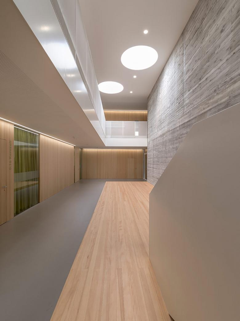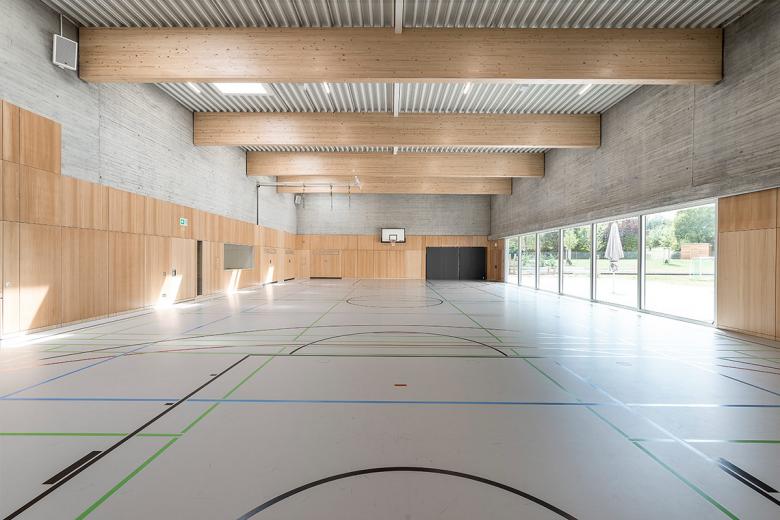 Die Zugänge zu Grundschule und Sporthalle erfolgen über einen angemessen dimensionierten Vorplatz von der Schulstraße aus. Beide Eingangshallen sind innenräumlich miteinander verknüpft. Die Zweigeschossigkeit und offene Verbindung zwischen den beiden Geschossen erleichtern die Orientierung im Gebäude