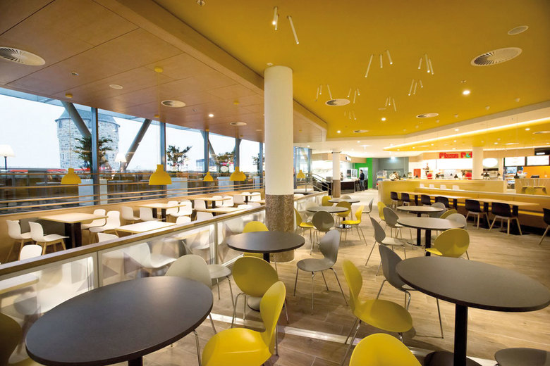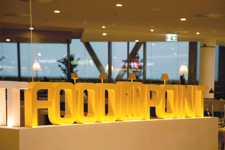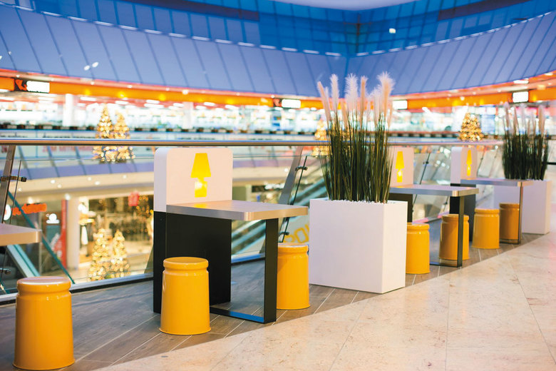 Auf Grundlage der Gestaltungskonzeption der ECE Creative-Design wurde ein LED-Lichtkonzept für den neuen „Foodpoint“ entwickelt. Leuchtenideen wurden aufgenommen und in ein Grundlichtkonzept, aus Lichtlinienelementen, die in den Foodpoint leiten, sowie Downlights in lockerer Anordnung, eingebettet. Die Downlights, dimm- und warm- bis neutralweiß steuerbar bilden die Basis der atmosphärischen Wirkung, die den Kunden morgens mit erfrischender Helligkeit begrüßen und abends mit entspannend reduzierter Intensität verabschieden soll.