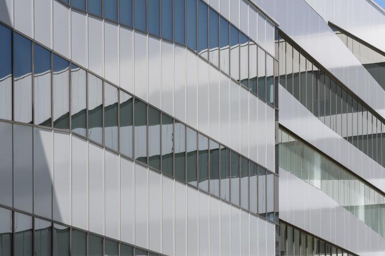 Durch die Ausbildung einer alle Fassadenflächen umlaufenden horizontalen Bänderung aus Fensterelementen und Brüstungs- oder Sturzverkleidungen ist es möglich die verschiedenen Nutzungen zu einer Großform zusammenzuführen und so eine homogene und eindeutige Gestalt zu definieren. Durch den abgeschrägten Verlauf der Bänderung, der sich nach den unterschiedlichen Nutzungen der Räume richtet, öffnet sich das Gebäude mit den Glasflächen zur prominenten Gebäudeecke hin. Außerdem erfährt die Fassade dadurch eine belebende Dynamisierung und die Herausarbeitung der Eigenständigkeit des Baukörpers.