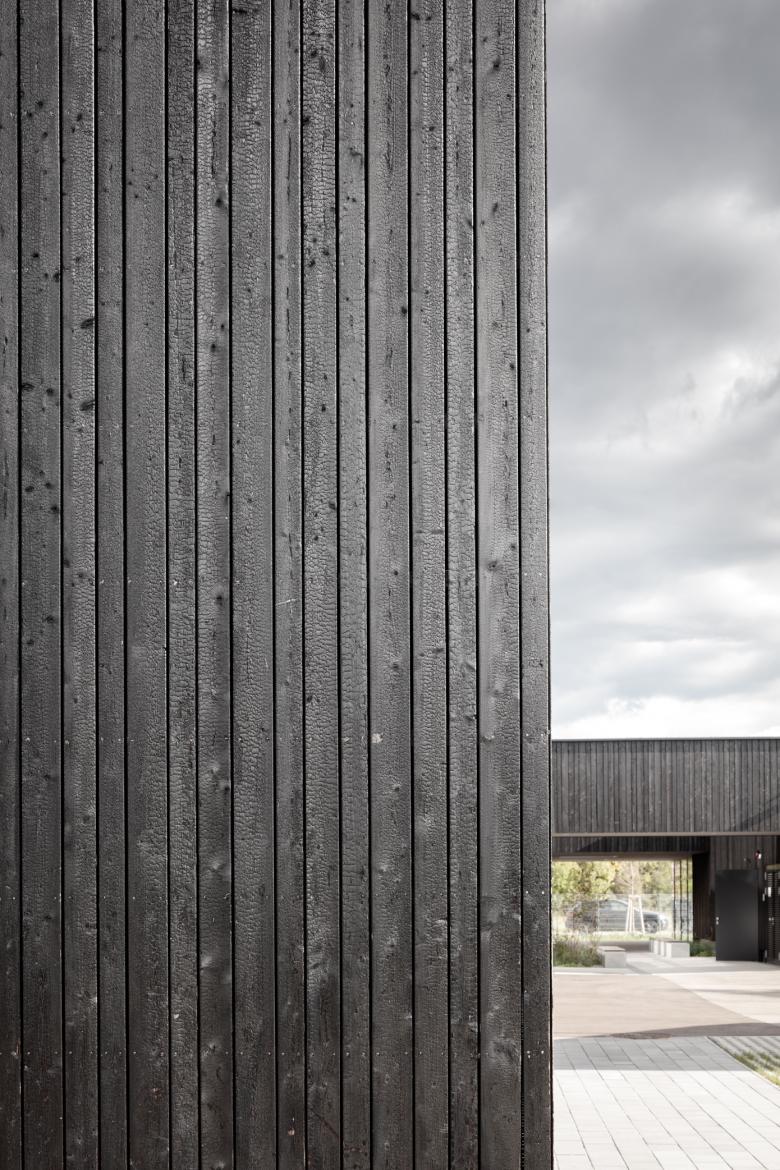 Das Erscheinungsbild beider Neubauten richtet sich nach der ländlichen Umgebung und wird geprägt durch eine einheitliche Hülle aus karbonisierten Holzlatten, die die geschlossenen Bereiche vor den massiven Brüstungen und Wandflächen verkleiden und die Gebäude optisch zusammenbinden. Durch das industrielle Verkohlen der äußeren Holzschicht wird das Material konserviert, indem die Kohle einen natürlichen Schutz gegen Pilze und Ungeziefer bildet. Mit dieser Technik kann auf Chemische Holzschutzmittel, Farbanstriche oder Beizungen und deren regelmäßige Erneuerung verzichtet werden. Zugleich wird ein sehr wirtschaftliches und nachhaltiges Fassadenmaterial in einer angemessenen Umgebung eingesetzt.