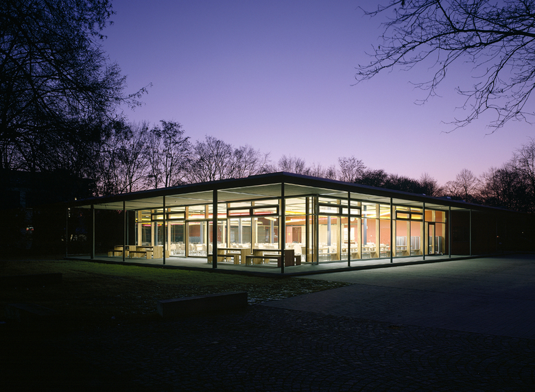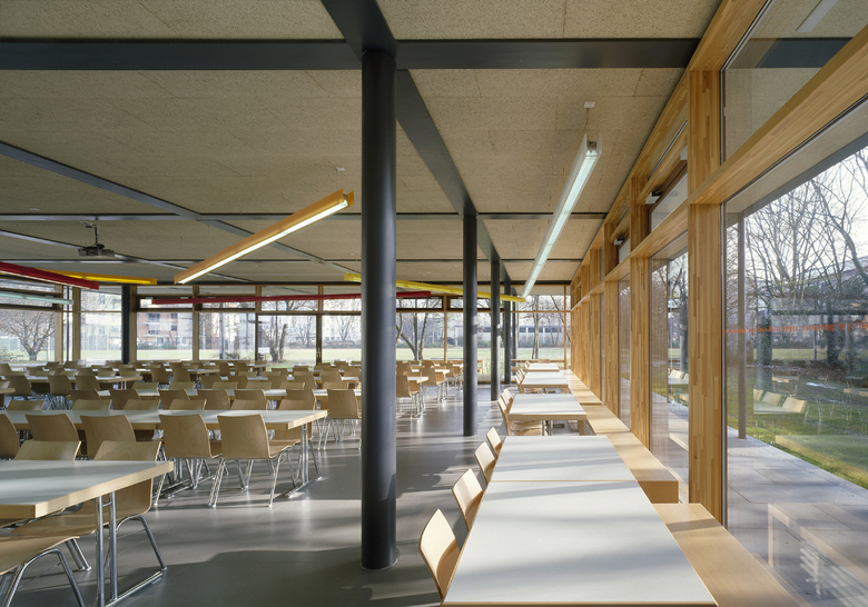 Der eingeschossige, rechteckige Baukörper ist mit dem verglasten Speisesaal und einer massiven Kernzone, in dem der Küchenbereich und die Essensausgabe untergebracht sind, zweigeteilt. Eine umlaufende Terrasse mit Vordach bindet das Gebäude zusammen und bietet geschützte Freiflächen mit unterschiedlichen Aufenthaltsqualitäten. Die vorhandene Begrünung wurde weitestgehend belassen und der Pausenhof neu gestaltet.