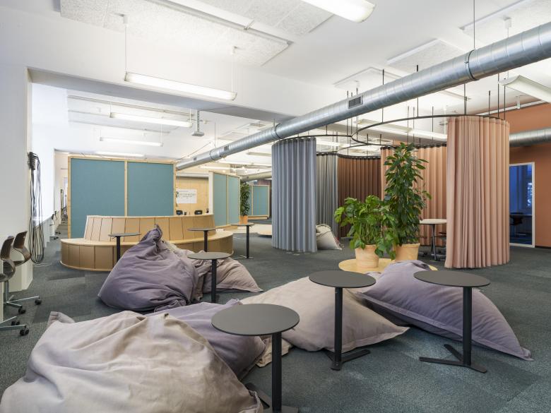 Die nachhaltige Herangehensweise bei der Umnutzung und dem Bauen im Bestand wird durch die flexible und reversible Möblierung und Materialwahl zusätzlich untermalt. Dem Leitbild der «New Rawness» folgend wurde bei der Möblierung auf nachhaltige, wiederverwendbare Lösungen wie Holzkonstruktionen oder Kartonmöbel gesetzt.