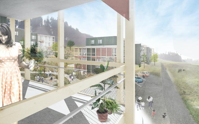 Durch die geschickte Setzung der Wohngebäude wird dazwischen ein hochwertiger und gemeinschaftlicher Aussenraum aufgespannt. Dieser erhält den bestehenden Grün-korridor und verbindet den Wald mit dem Weideland im Norden. Somit wird die Aussicht ins Dorf ermöglicht. Der Weg schlängelt sich am Hang entlang und erschliesst die Häuser «hofseitig». Entlang des Fussweges befinden sich verschiedene Spiel- und Aufenthaltsbereiche für verschiedene Bedürfnisse, die zum Verweilen einladen und den Austausch der Bewohnenden fördert.