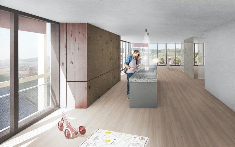 Aufgrund der Grösse und der exponierten Lage bekommt die Siedlung eine formale Eigenständigkeit. Die Überbauung versteht sich als Bindeglied zwischen Landschaft, Dorf und Waldsaum. Die Werte des dörflichen Zusammenlebens werden damit ins einundzwanzigste Jahrhundert transportiert.