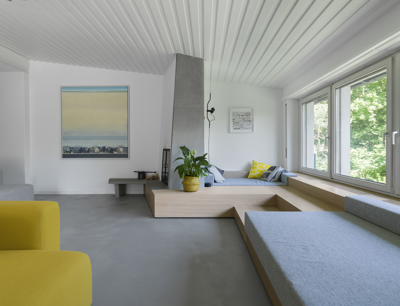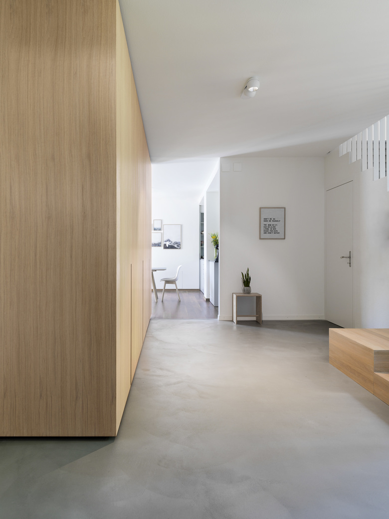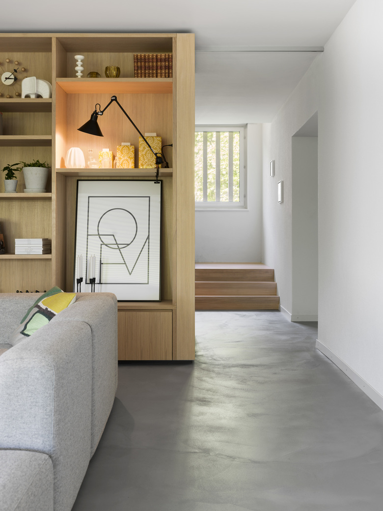 Die Bauherrschaft übernimmt das Gebäude in dritter Generation. Ohne die klassischen Qualitäten zu schwächen, soll die Raumorganisation den Bedürfnissen der jungen Familie angepasst werden. Der zentrale Körper hält zwar die ursprüngliche Raumfolge Halle – Küchen – Wohnen – Bibliothek aufrecht, sein Umraum ermöglicht aber eine Neuinterpretation und einen dynamischen Familyflow. Die Neugestaltung der Treppe sowie der Einbau einer Sofalandschaft fassen den Raum und schlagen die Brücke zwischen damals und heute.