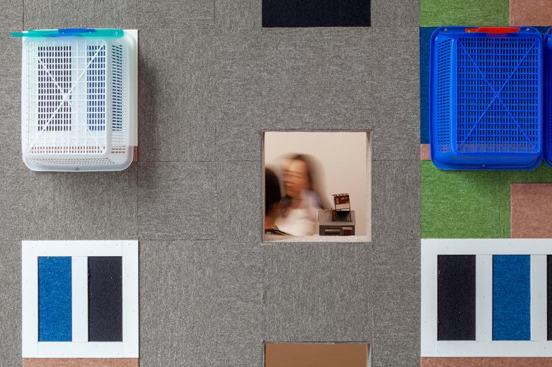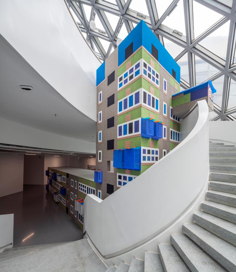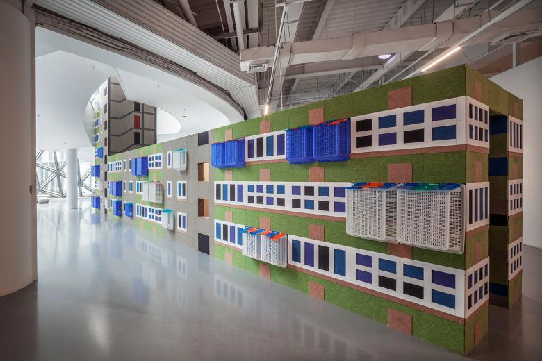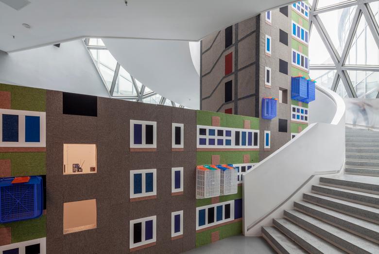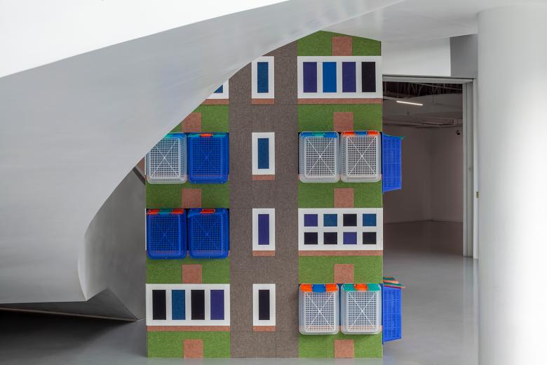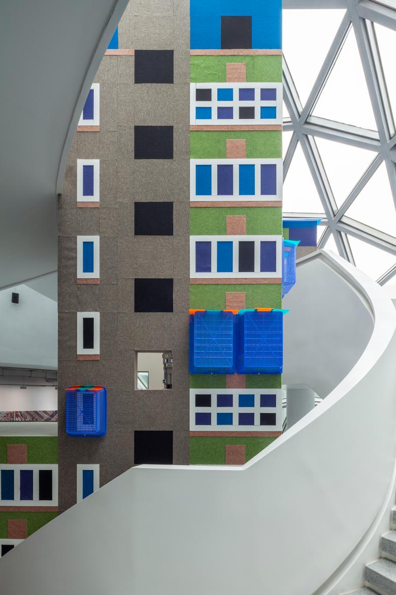 A site-specific installation to reproduce a typical Chongqing apartment building on the scale of 1:4 with everyday objects, e.g. carpet, felt, plastic sheets, and plastic baskets.