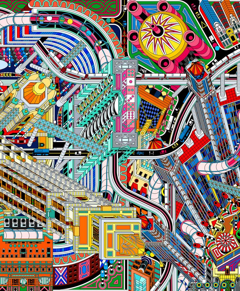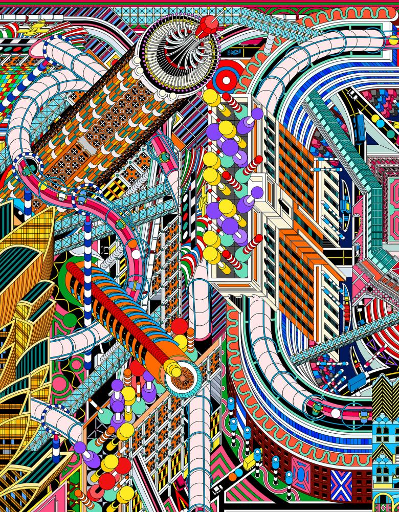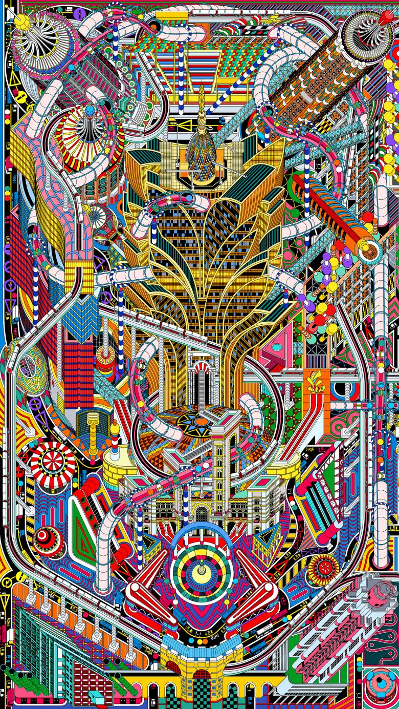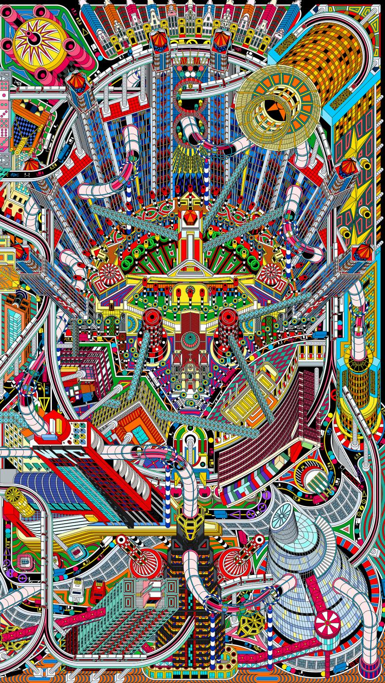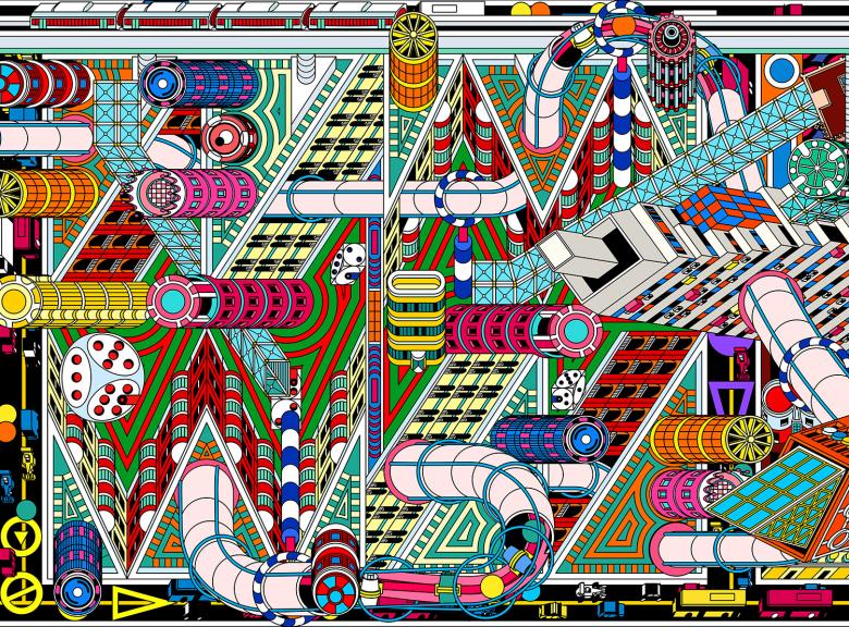 DAS was not only intrigued by the unique architectural style of those casinos in Macao, but was also inspired by the interface design of casino games as a reference for urban planning. The interfaces of popular games such as Pinball, Pachinko, Craps, Pat Gow, Roulette… are all featured with clear organizational structure, geometric layouts, and interesting combination of flat graphics, very much like the master plan of a city or urban block. In order to strengthen this drawing's reference to casino culture, DAS adapted the layouts of those casino games to design a new master plan for Macao. Divided by two narrow horizontal windows on the wall, the mural consists of 5 independent drawings, each based on a plan transformed from different game interfaces. The landmark casinos, historical buildings, and other vernacular constructions are rearranged on those new plans. Learning from the Symbolist approach observed in the casino architecture, DAS also designed some new buildings for the city. Chips and dice become buildings and widgets of the gaming machines become landscape installations, all being mixed with architecture from the reality. These 5 drawings are then seamlessly connected by line elements such as pipes, sky trains and highways to form a complete urban landscape of Macao. The positioning of the buildings, design of the landscape, and routes of traffic lines also refer to the structures of the actual gaming machines. In the end, the whole city stands up as if from the interfaces of the games, and all the constructions become “components” of the games.