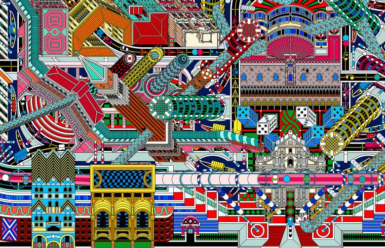 Known as the Las Vegas of Asia, Macao is a thriving home of casinos and entertainment. Such an analogy is naturally a reminiscent of the legendary publication Learning from Las Vegas. The book evoked a return to ornament and symbolism in architecture, and a new focus on the architecture of the everyday. Observing Macao in a similar perspective, the impact DAS felt from its casino architecture would probably be no less than that Venturi, Scott Brown, and Izenour experienced from those “decorated sheds” and “ducks” in Las Vegas. From Grand Lisboa to Studio City, those casino buildings never lack intricate decoration or exaggerated shape. They stand proudly in the city as symbols of wealth, attracting tourists from around the world. To DAS, such a kind of honest expression of desire in architectural design is also worthy of academic attention. DAS hoped to carry forward the spirit of Learning from Las Vegas and embrace the controversial aesthetics exemplified in those casino buildings. Instead of many famous historical landmarks preserved from the Portuguese colonial era in Macao, DAS chose to make the casino buildings the protagonist of the drawing and the proud symbol of Macao in their new portrait for the city.