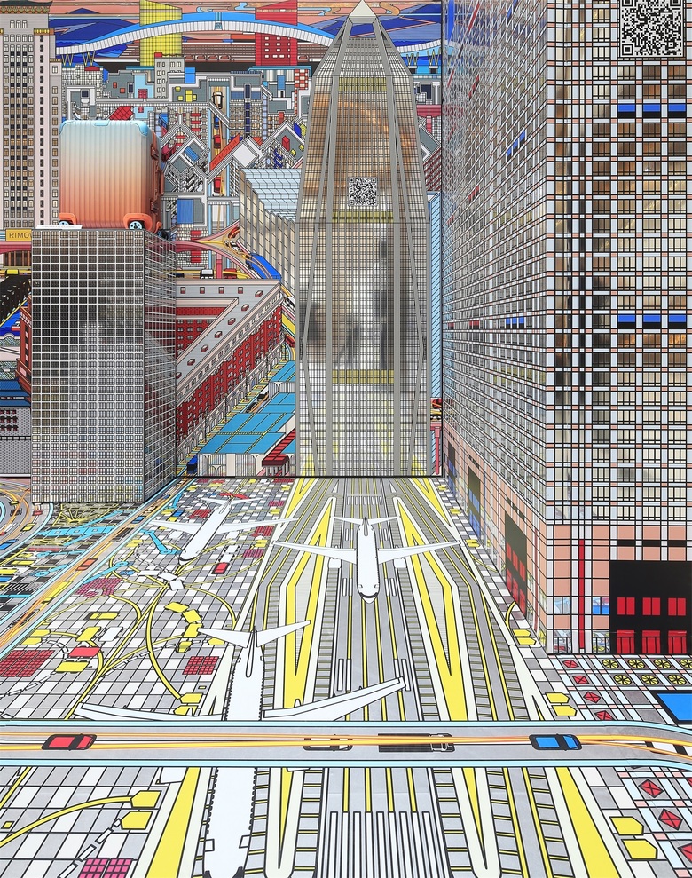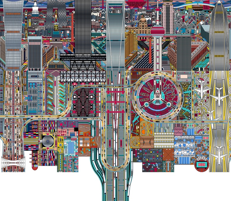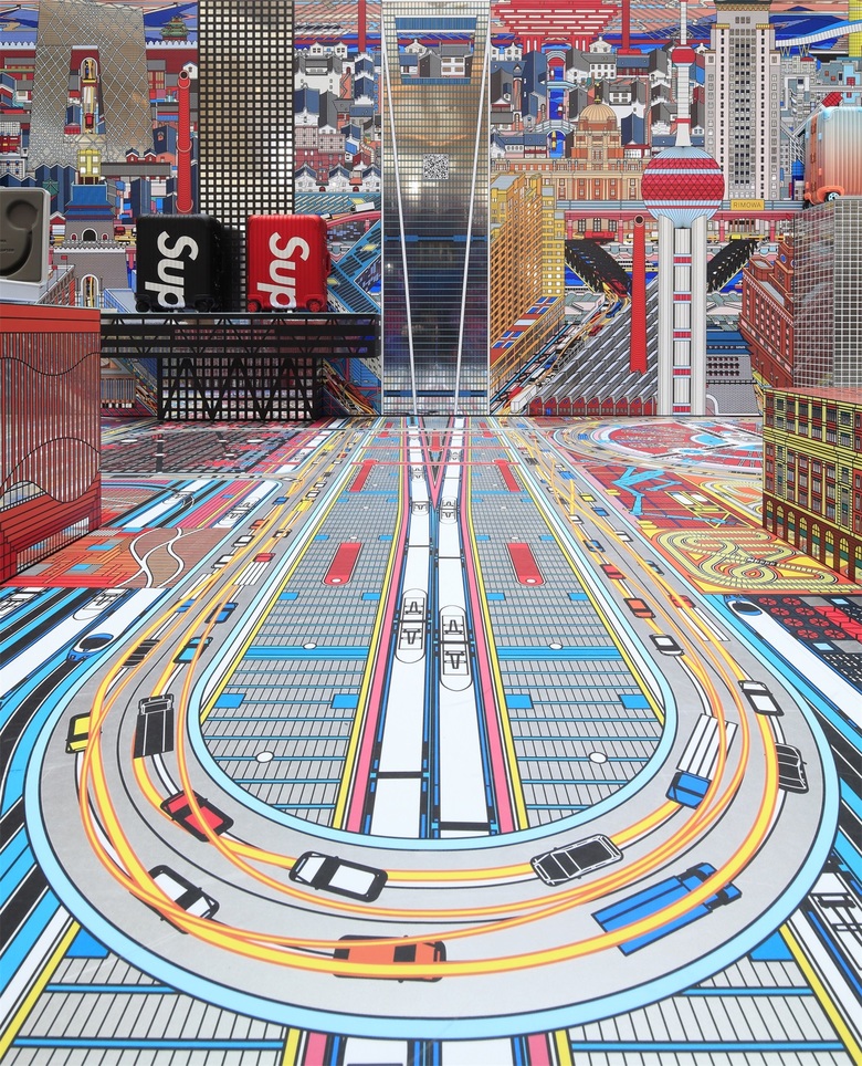 The exhibition is scheduled to tour in Shanghai, Beijing, and Shenzhen. So, the visual content of the installation is a collage in which the landmark architecture and urban scenes from those three cities are represented in one image.