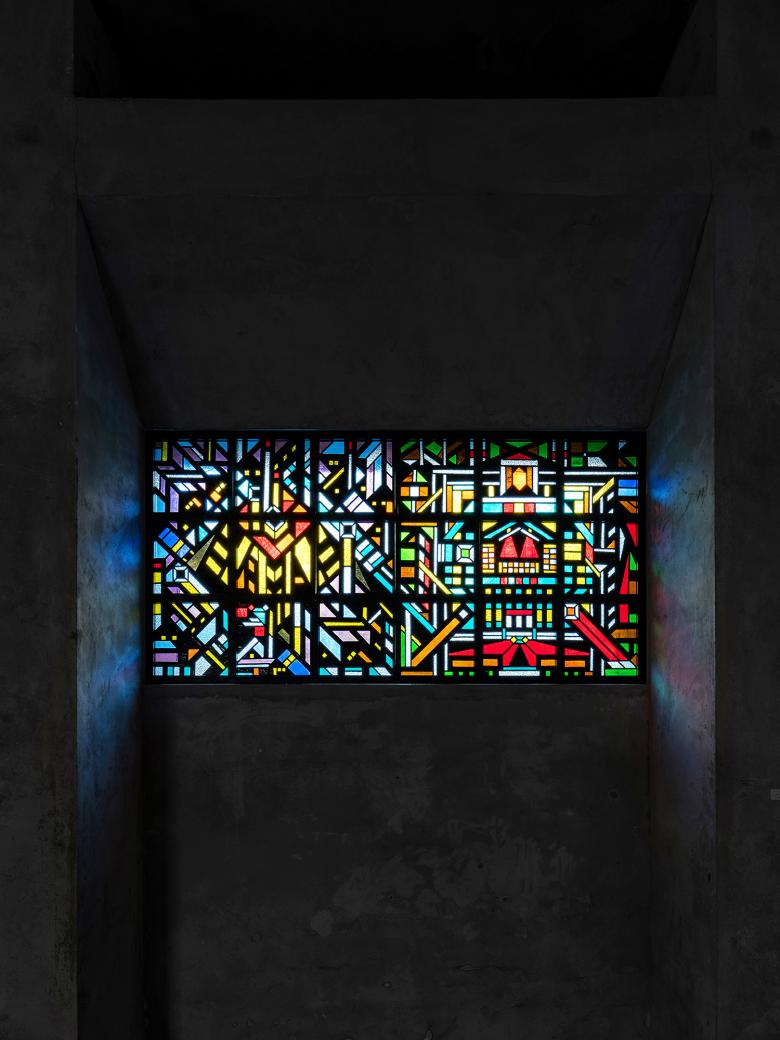 In DAS’ previous works, they always rely on many details of life for the portrayal the everyday space. But in this piece, the details of everyday life become some abstract and simplified symbols: dancers wearing hanbok dress, groups performing gymnastics, portrait of the leader, sentinels, police booth, chimneys, trucks … On one hand, this is to adapt to the production process of stained glass, avoiding the production challenges of too fine details. On the other hand, it reflects the sense of mystery and strangeness that one would feel when looking across the river to North Korea.