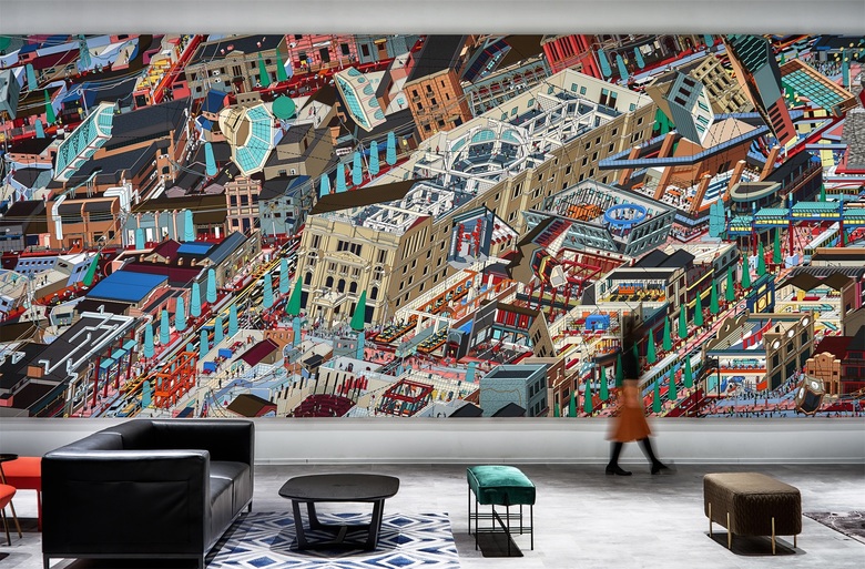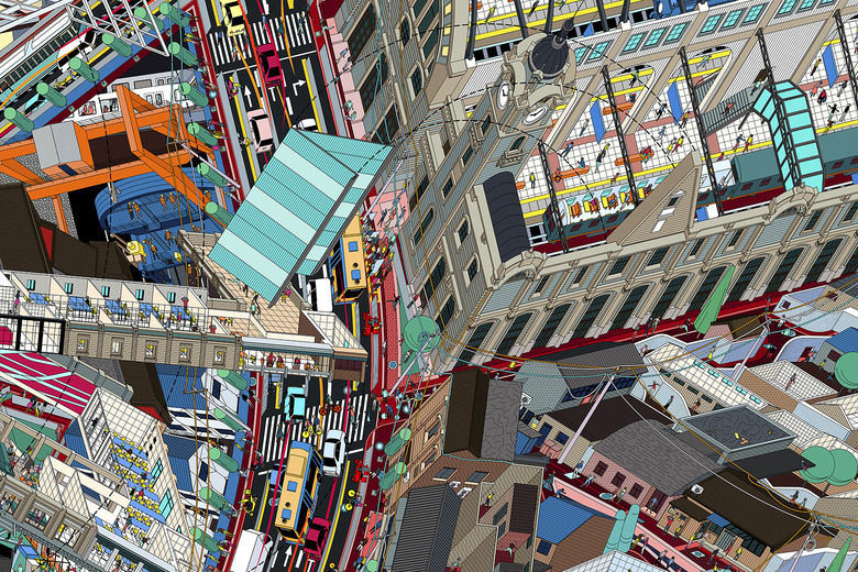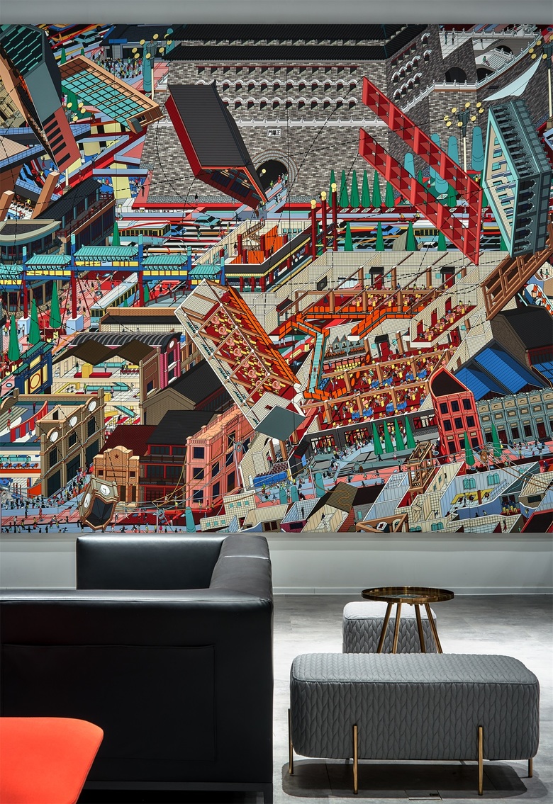 Under the Zhengyangmen is an axonometric panorama created for the co-working brand Ucommune for its branch at Dajiang Hutong in Beijing. Taking the Qianmen area where Ucommune is located as the subject, DAS explores the application of inclining oblique projection, rotated explosion, and road network in the panorama and tries to reveal the representational power of architectural drawing that transcends the reality while recording it.