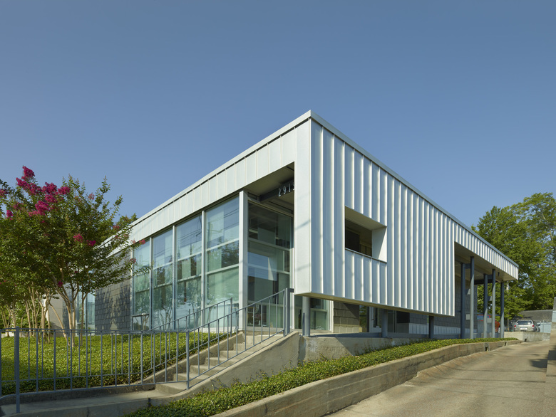 Renovation of a one-story commercial building into an architect’s office and studio, keeping slightly reminiscent of its 1950s ancestry, while stepping into the current emerging arts district environment. The transformation began with removal of the roof and interior walls. Within the existing exterior walls and foundation, a new steel frame provided the support for the higher roof and created an open plan, while large wall openings were cut to allow for natural light, entry doors, and views. Insulation and a new skin of slate and standing seam metal layered over the existing masonry walls created a more watertight, insulated enclosure while preserving existing materials. The configuration of the light monitors shields the spaces below from direct sun while providing indirect light and color that changes with time of day, time of year, and weather conditions. Duvall Decker acting through its development entity, Eldon Development, led the development and financing of the project and served as architect for the design of the facility.
