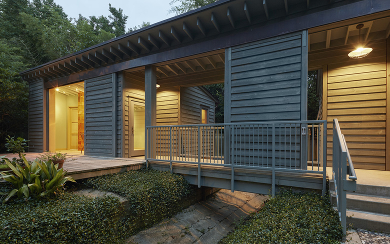 The architect’s solution was to follow the historic tradition of neighborhood back buildings but instead of three building projects, they united all three programs into one building. The solution includes a pool house, bridge, and garden shed linked to accomplish the owner goals. In order to transform the pool house into an open sitting area opposite the pool, large barn doors open and fully and move over the creek and cover the bridge adding privacy to the back yard when the owners are using the pool and pool house. The copper clad shower structure anchors the composition and provides a “hot figure”. The copper is visually hotter than the summer air, psychologically increasing the contrast and sensitively for everything cool; the greenery of the lush garden, the pool water, and the shady sitting area.