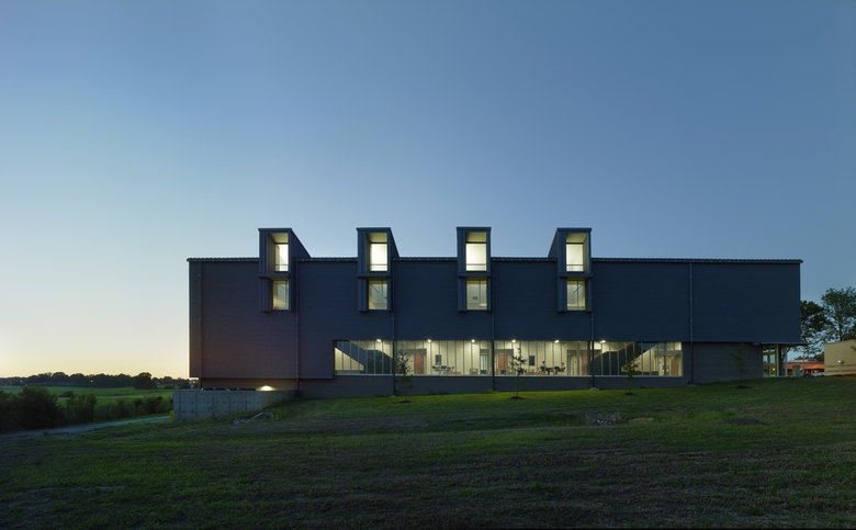 The building is designed to reduce energy consumption through both active and passive strategies. As external heat gains generally outweigh internal loads here, an integral architectural umbrella shadows the building. Convection facilitates the movement of sun-heated air up the southern, eastern, and western facades, through the attic and out to the north. The heat given off through the first layer of construction never penetrates the thermal envelope of the building, ensuring a temperate interior with substantially reduced cooling loads. The north façade acts as a light lens, with frosted and clear glass to maximize natural northern light refraction into the interior that illuminates the classrooms and minimizes the need for artificial light.