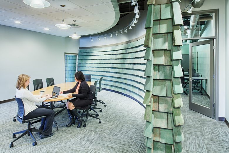The three-part design started with the shell, the abandoned furniture store cleaned out and repaired. The order of rooms in which legal service office operations take place, are built with inexpensive gypsum board partitions. The rooms are located to allow natural light to course into the inner plan. At the heart of the plan, a dynamically-shaped, clay-tile sheathed wall arcs and leans through the space, providing a landmark that not only unites all the rooms, but more importantly, establishes a tactile enveloping, dynamic anchor; a kind of inner horizon that is both secure and hopeful about the future.