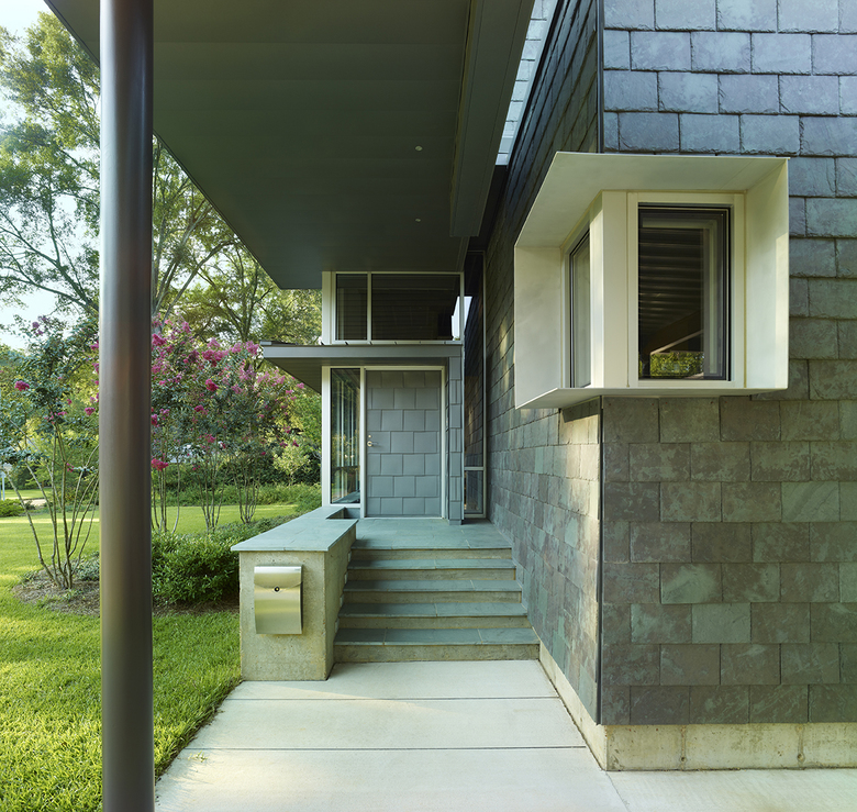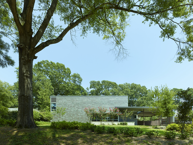 A three-bedroom single family home with open living/dining space and detached screen porch and pool. The L-shape house plan consists of a public wing designed like a courtyard sitting between the street and the private rear yard, and a more private bedroom wing along the south side of the property. An inner green rear yard is an extension of the living space connected by a full wall of curtainwall. The design comfortably accommodates daily living patterns and is durable and ecologically mature. Direct and indirect light color and characterize interior spaces throughout the day. The sun is directly harnessed to produce energy and heated water. The material pallet builds space for experiences through expanded contrasts; between rough to smooth, hard and soft, cool and warm.