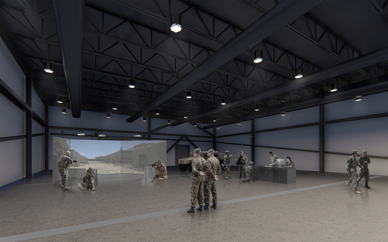 A new 6,000 SF building for the Army National guard simulation training and skill development facility. The Squad Advanced Marksmanship Trainer (SAM-T) is Training as a Service (TaaS) solution designed to enable army readiness and bridge the dismounted virtual collective training capability gap pending fielding of the Soldier/Squad Virtual Trainer (S/SVT) in FY21. The facility must accommodate multiple arrangements of staging of three-dimensional projection screens with props for simulated battle environments. The technology for simulation training is changing yearly and as such the building infrastructure must also look forward to accommodate many types of simulation and virtual training equipment needs.