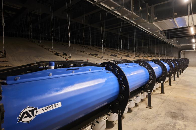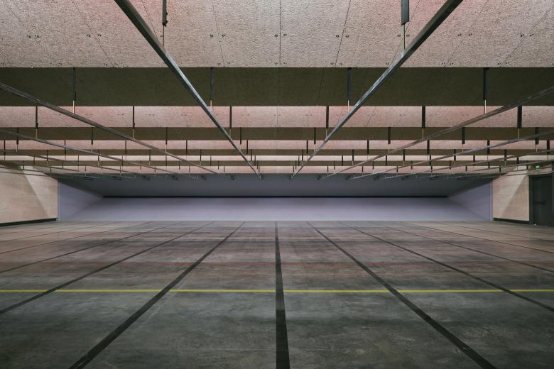 The facility structure is supported with 8” thick tilt-up concrete load-bearing wall panels connected and bridged by a steel truss structure. The steel structure also supports an angled steel plate ceiling system that directs the trajectory of spent ammunition to the rear catchment system. The range space is only ventilated with air moving across the lanes from fans located on a mechanical platform above the support spaces. The ventilation moves all smoke, dust, and lead particles away from the guard personnel to the air filter system at the rear of the facility. Spent ammunition is collected and recycled. All ballistic-safe surfaces are covered with acoustic-dampening insulation. The classroom and training spaces located at the front of the range are environmentally separated and conditioned.