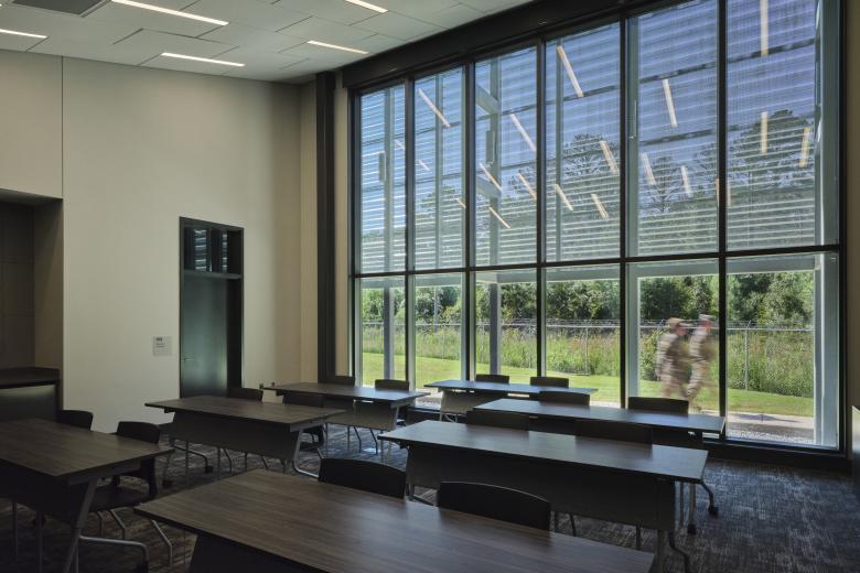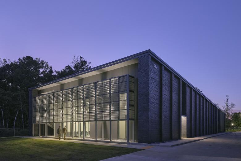 The building envelope is designed to minimize interior heat gain and moisture intrusion. The range east and west walls are designed as brick veneer vented rainscreens over insulation which allows constant convection to minimize heat transfer into the tilt up concrete structure and interior. The roof is a floating standing seam metal system over insulation which also limits heat gain. The southern-facing glazing of the classroom is screened by a perforated metal sunshade allowing ample natural light without solar gain. The envelope strategies have proven to be highly effective in maintaining comfortable temperatures in the unconditioned range space and minimizing energy consumption in the conditioned education and support spaces thus avoiding the effects of the southern hot humid climate.