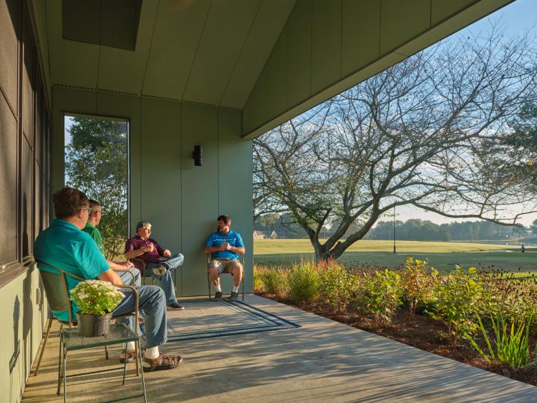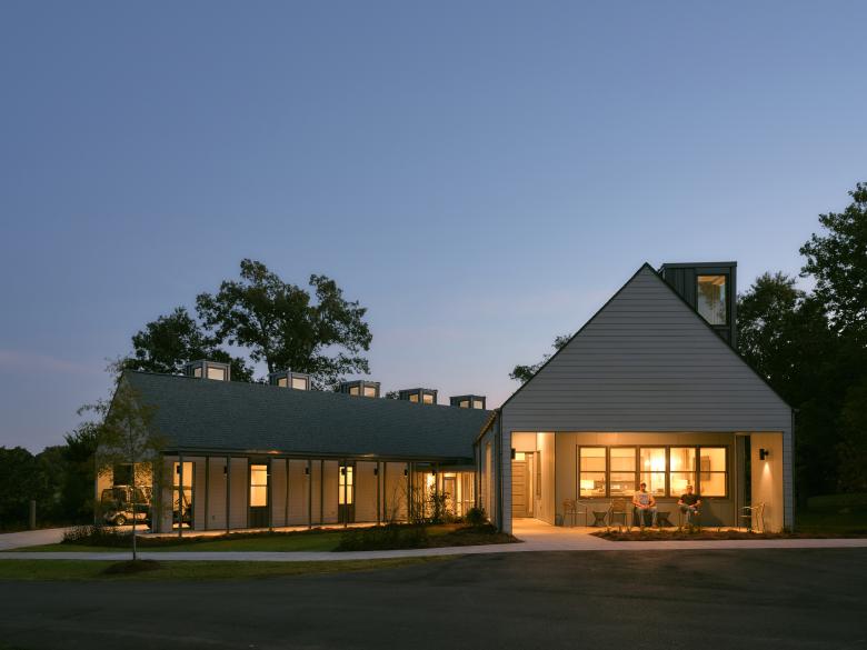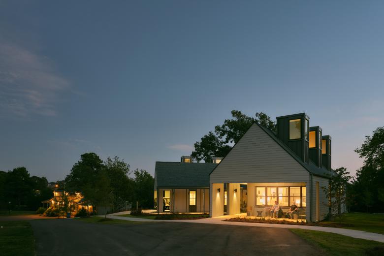 The quantitative program for each 3,532 GSF house includes five bedrooms, each with accessible private bathrooms, living, dining, kitchen, a meeting space, half bath, laundry, a direct support staff desk, porch, covered parking for golf carts and bicycles, and an outdoor gathering space common to all the houses.