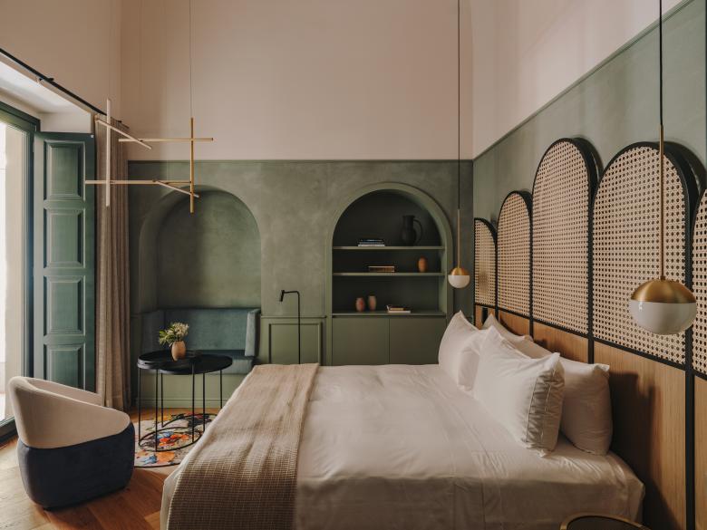 En primer lugar, hemos optado por la integración de elementos históricos, a través de conservar y resaltar los detalles arquitectónicos originales del palacete barroco del siglo XVIII que alberga el hotel, como molduras, techos altos, bóvedas o arcos. Esta integración permite que los visitantes sientan la historia y la autenticidad del lugar.