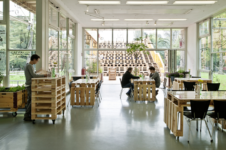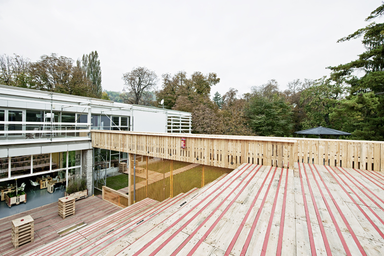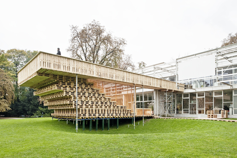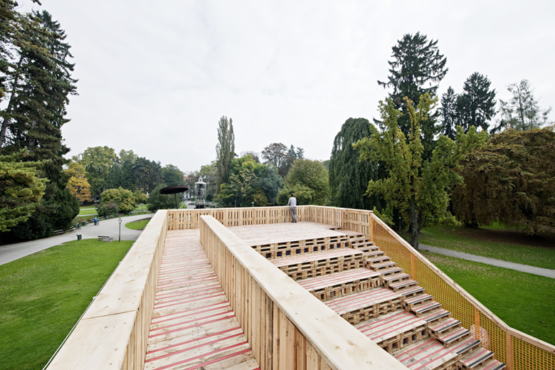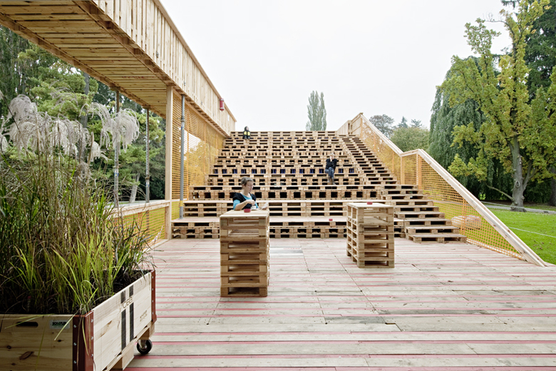 Festivalzentrum im Stadtpark – Nomadisch wie das Festival ist auch sein Zentrum, das in jedem Jahr einen neuen Ort findet und sich dort auf Zeit heimisch niederlässt – diesmal im Forum Stadtpark und gestaltet vom jungen österreichischen Architekturkollektiv feld72, das sich vor allem mit urbanen Interventionen hervorgetan hat. Selbstbewusst und zugleich ressourcenschonend geriert sich das Festivalzentrum heuer als Hochstapler; trickreich und mit einem Hang zum Größenwahn. Aus alltäglichen, recyclebaren Europaletten – einem billigen, standardisierten Massenprodukt, entwickelt für reibungslosen Warenverkehr – wird virtuos ein Anbau aufeinandergestapelt und als neue Achse quer durchs Forum hinein in den Park geschoben. Das Baumaterial ist gemietet; so massiv es in die Architektur eingreift, so sichtbar ist auch, dass es wieder verschwinden und in den Warenkreislauf zurückkehren wird.