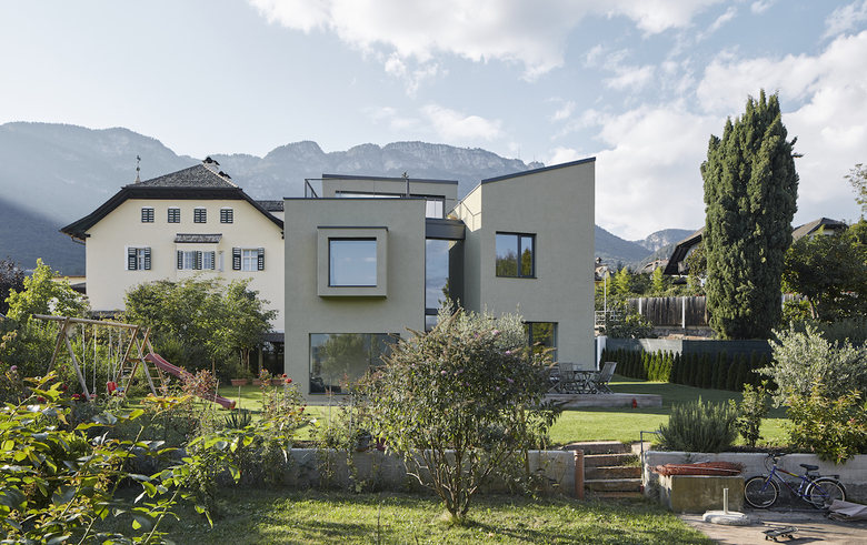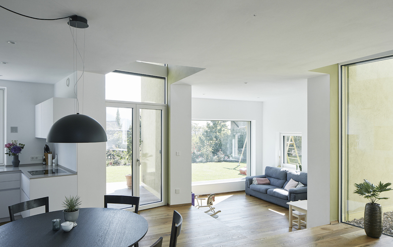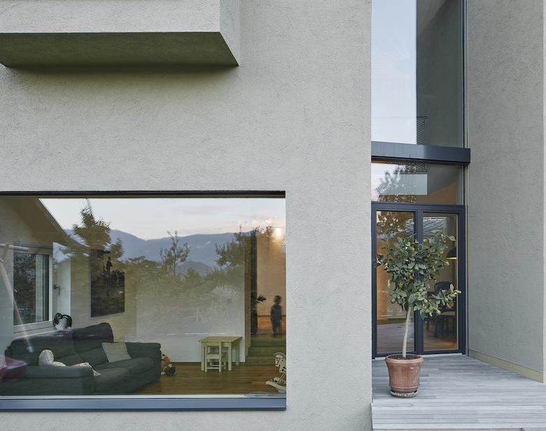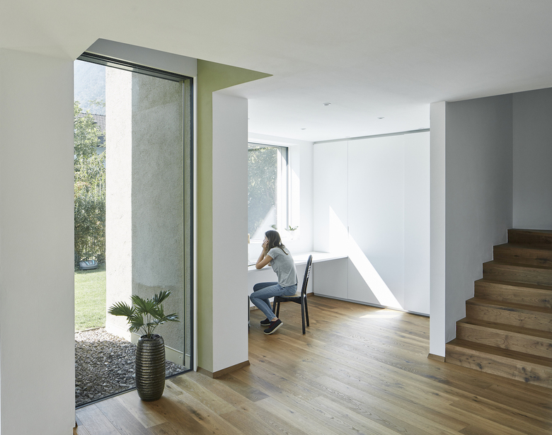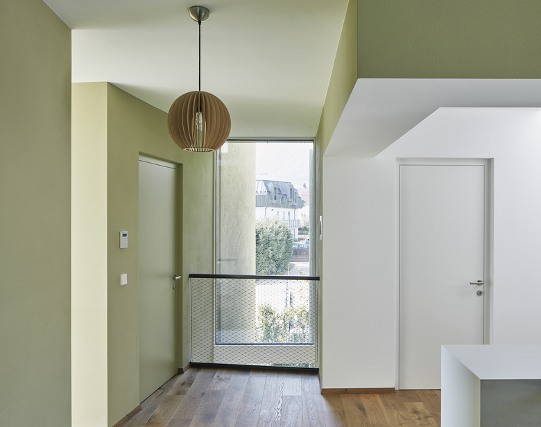 Zwischen drinnen und draußen – Wie in einem Dorf, spielt sich auch im Haus D. das eigentlich Leben zwischen den Häusern ab. Man begegnet sich auf der zentralen Piazza wo die im Erdgeschoß gelegenen Wohnräume ineinanderfließen. Durch Lufträume ergeben sich von hier aus horizontale und vertikale Blickbeziehungen quer durch das Gebäude, wobei die Intimität der Räume nach oben hin zunimmt. Durch Glasfugen zwischen den massiven Baukörpern genießt man vom zentralen Wohnraum aus quasi einen 360° Rundumblick und erhält Tageslicht aus allen Himmelsrichtungen. Innen und Außen verschmelzen besonders dort stimmungsvoll miteinander, wo sich der aus der Umgebung abgeleitete Pistazienton der Fassaden konsequenterweise im Inneren fortzieht. Wo Außenwände zur Innenwand werden, entwickeln sie sich teilweise zu Möbeln und anderen Bauteilen, welche die Kontur der Türme vervollständigen.