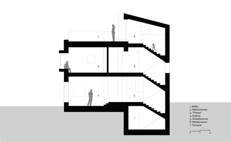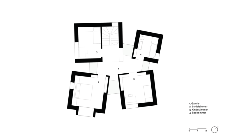 Vier in einem – Rund um eine hausinterne Piazza wurden vier turmartige Baukörper arrangiert die nach außen relativ homogen sind, nach innen jedoch entsprechend ihrer unterschiedlichen Funktionen einen ganz eigenen Charakter haben. So befinden sich die Nassräume im sogenannten Wasserturm, die Treppe im Stiegenhaus und in zwei weiteren Volumina mehrere Schlafzimmer sowie ein Arbeitsraum und ein Medienraum. Brückenartige Galerien stellen Verbindungswege zwischen den Baukörpern her, wobei die Raumhöhen entsprechend der unterschiedlichen Funktionen variieren und spannende räumliche Situationen entstehen lassen.
