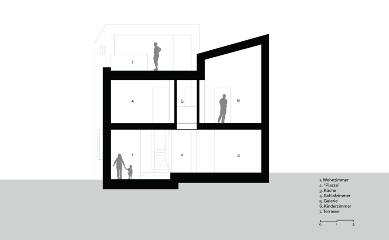Das Haus als Dorf – In unmittelbarer Nähe zum Elternhaus und in direkter Nachbarschaft zum Einfamilienhaus der Schwester, war es auch der Wunsch des jüngeren Bruders sich den Traum der eigenen vier Wände zu erfüllen. Geworden sind es am Ende einige mehr. feld72 hat bereits Entwürfe für die beiden Schwestern umgesetzt und genoss beim Bauherrn und seiner Familie vollstes Vertrauen. Durch dessen Mut gelang es ein außergewöhnliches Konzept umzusetzen, das über die kleine Grundfläche hinwegsehend der Bauaufgabe mit einem so unkonventionellen wie zielführenden Ansatz begegnete.