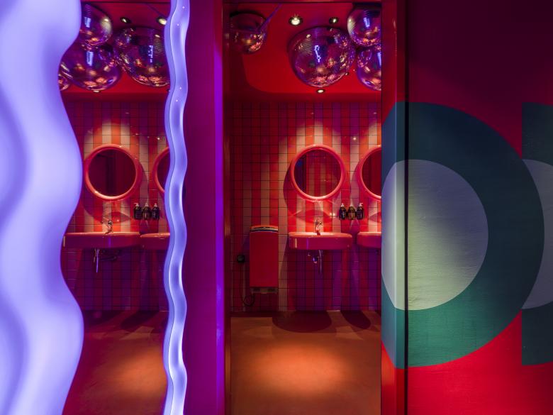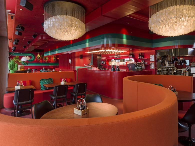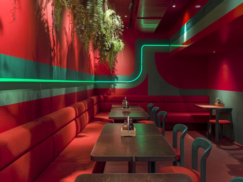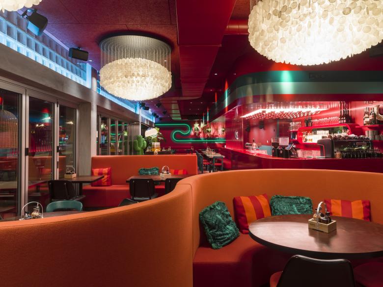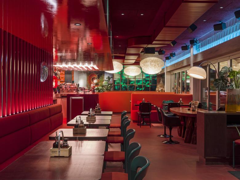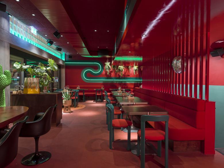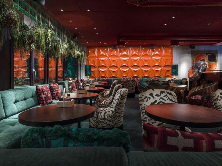 Die innenarchitektonische Grundstruktur entsteht aus partiell heruntergehängten Decken und einem Podest mit seinen Rundungen. Diese Elemente bilden die Basis für den 70s Style. Die Loft eines Rockstars verkörpert mit Deisgnstücken aus dieser Zeit und weiteren Requisiten aus fernen Ländern, passend zum Standort, Freiheit und Nonchalence. Für den starken Auftritt sorgt auch die Farbe Rot, dies unterstreicht das 70s Revival als Interiorkonzept.