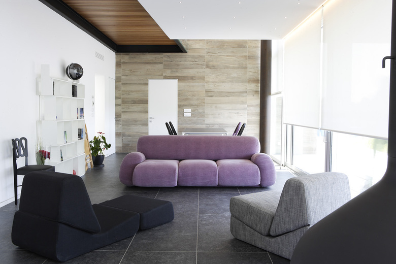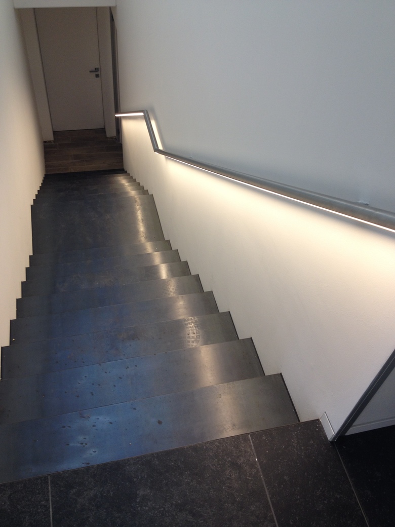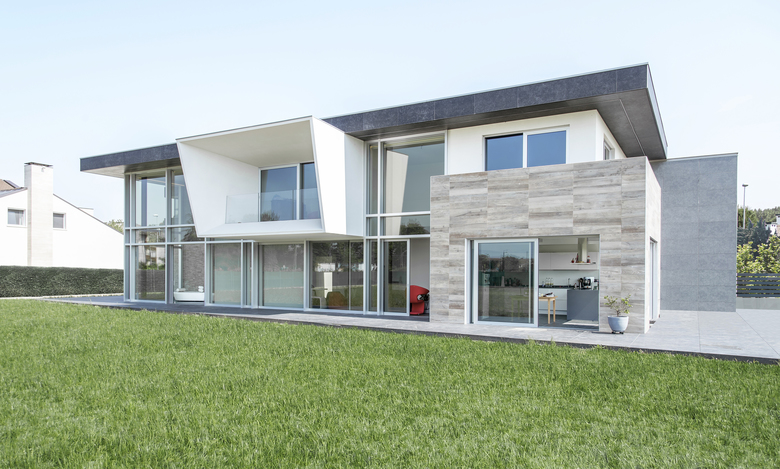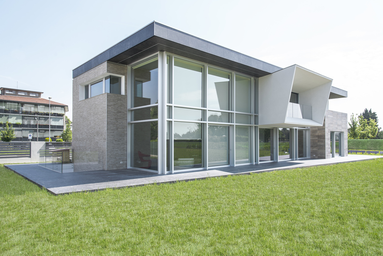 4. wall - the building is completely closed to the north by a wall in bare reinforced concrete. The only openings on the ground floor (the small windows of the bathroom and the laundry room, the door of the central heat and the garage door), are covered in order to not be visible in the septum wall. The building opens on the south looking out through the large glass wall the surrounding garden.