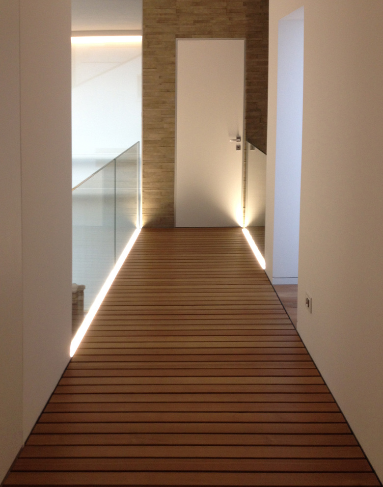 3. connections - a hidden staircase connects the ground floor to the first floor. On the first floor a boardwalk, suspended over the empty double-height as a bridge, connects the “boxes”. The design features emphasize the lightness (metal profiles, wood slats floor, glass railings);