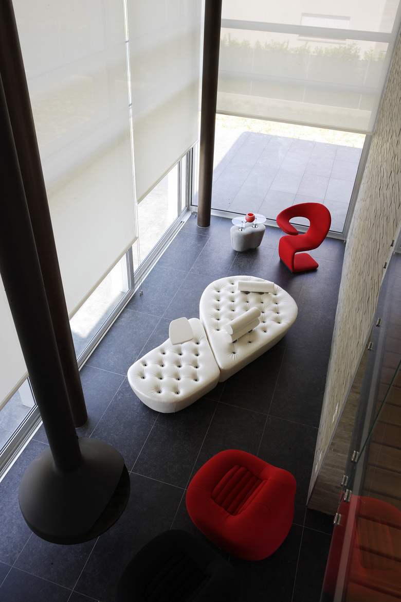 5. space - particular attention has been paied to the quality of the interior space. The common areas, between the volumes, are double-height and crossed by the suspended bridge, they allow the use of a airy and articulate space, while maintaining the vision of the individual elements of the composition, characterized by simple shapes, smooth surfaces and different materials.